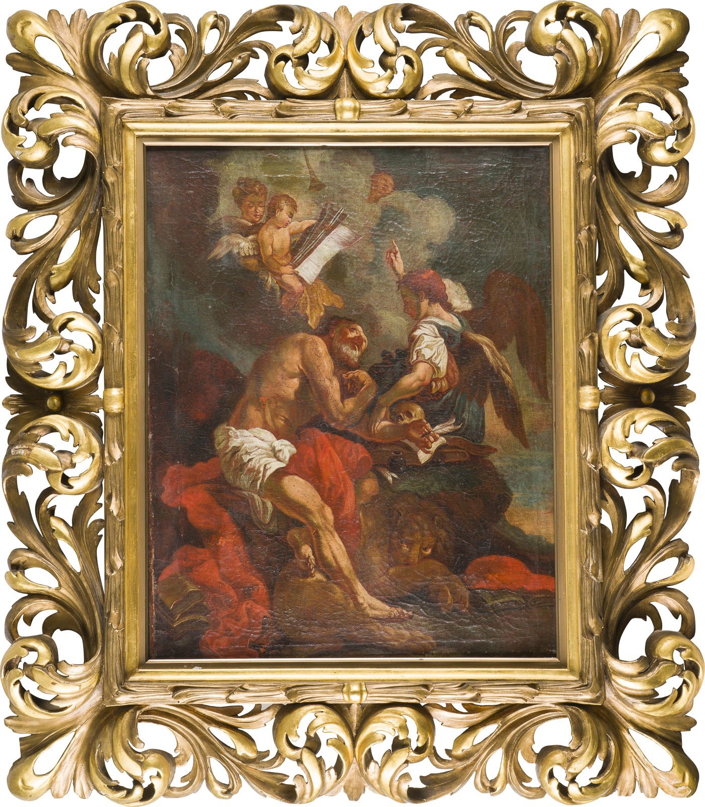 JOHANN LISS (SCHOOL) 1597 Oldenburg in Holstein - 5 November 1631 Verona THE INSPIRATION OF SAINT JEROME Oil on canvas (relined). 67 x 53 cm (F. 100 x 97 cm). Min. old rest., min. old retouching, craquelure, surface soiled. Frame. Provenance: South German private collection.