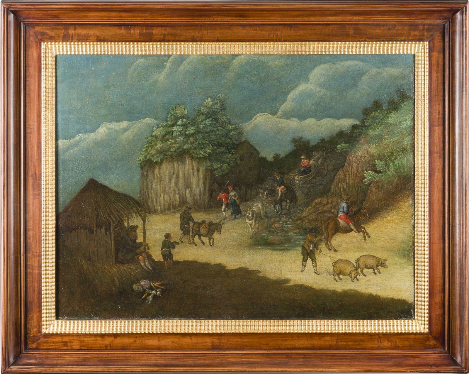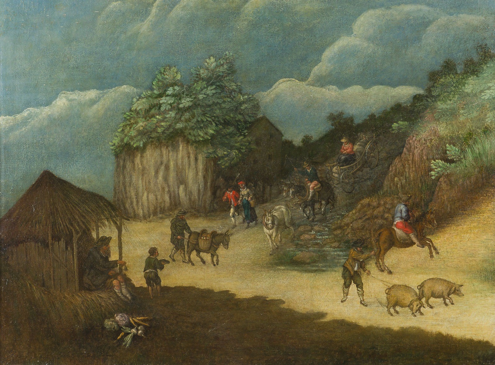 FLEMISH SCHOOL, AROUND 1600 VILLAGE LANDSCAPE WITH FARMSTEAD Oil on canvas (old relined). 57 x 76.5 cm (F. 78 x 97 cm). Part. min. old rest., min. old retouching, edge areas with min. paint losses. Frame. Provenance: International private collection.
