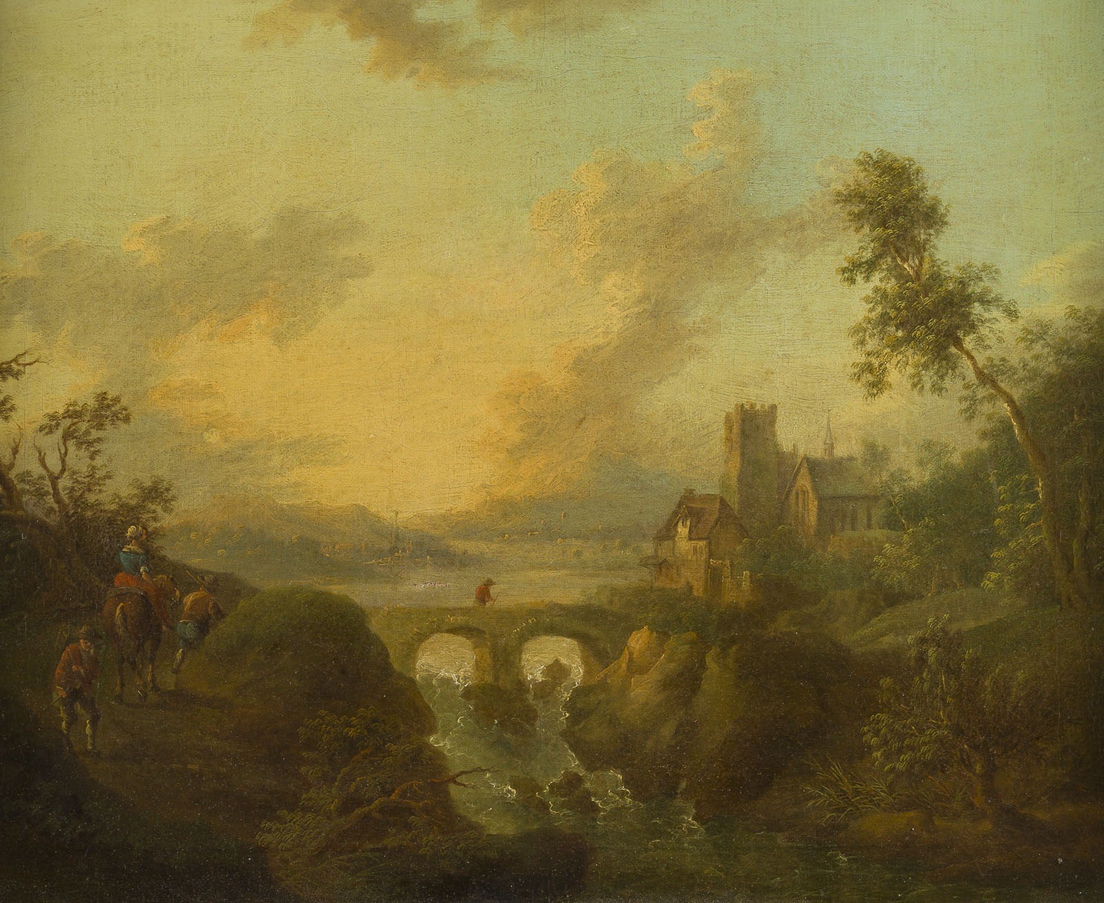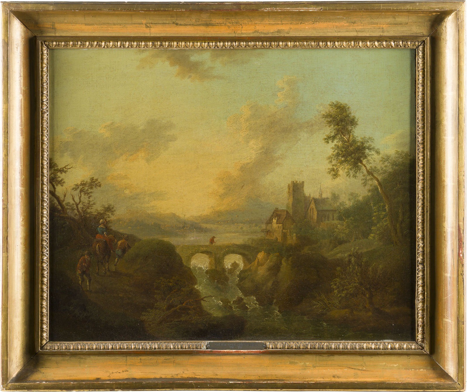 CHRISTIAN GEORG SCHÜTZ THE ELDER (SCHOOL/FOLLOWER) 24 September 1718 Flörsheim am Main - 3 December 1791 Frankfurt am Main A WIDE RIVER LANDSCAPE WITH CASTLE AND RIDERS Oil on canvas. 44 x 55.5 cm (F. 56 x 67 cm). Possibly old monogram remains at the bottom centre. Part. old rest., part min. old retouching. Frame. Provenance: Private collection, North Rhine-Westphalia.