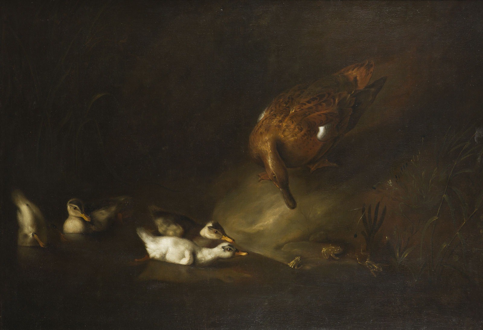 ATTRIBUTED TO PHILIPP FERDINAND DE HAMILTON Around 1664 Brussels - 1750 Vienna DUCK FAMILY Oil on canvas (relined). 85.5 x 123 cm (F. 106 x 143.5 cm). Min. old rest., min. old retouching. Frame. With dramatic lighting, the painting shows a group of live ducks in a dark, nocturnal riverside landscape. A diving duck enlivens the scene with dynamic movement, while the warm light makes the animals stand out vividly from the deep brown tones of the background. The atmospheric depiction of nature and the sensitive rendering of the plumage are reminiscent of Nordic animal painting around 1700 and are stylistically very close to the work of Carl Wilhelm de Hamilton. Provenance: East German private collection.
