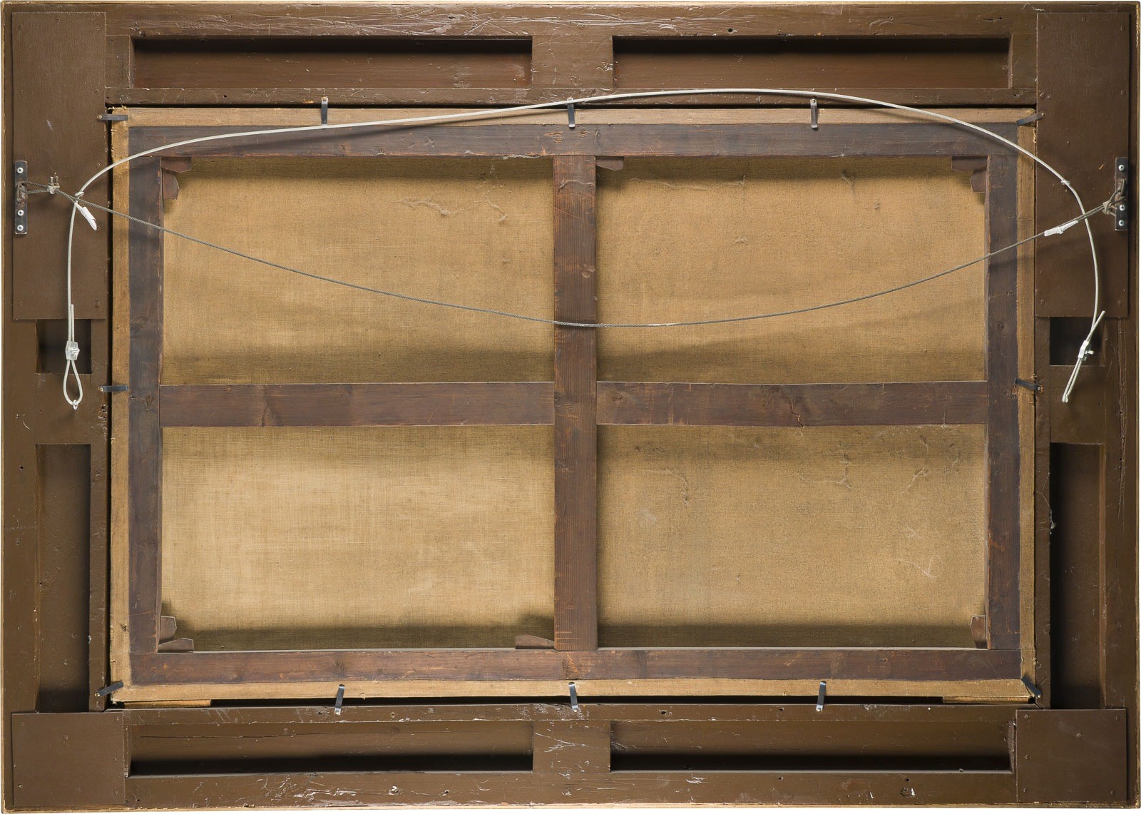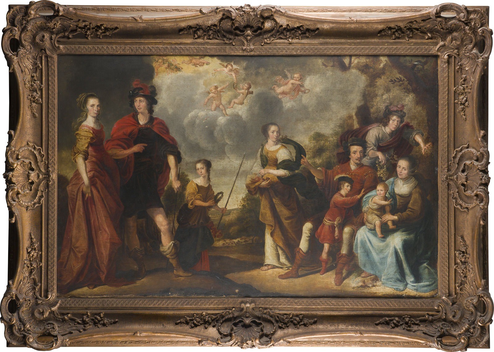 DANIEL MIJTENS THE YOUNGER (AND ATELIER) 1590 Delft - 1647 The Hague FAMILY PORTRAIT (PROBABLY JOHAN DIMMER, SOLLICITEUR MILITAIRE IN THE HAGUE, WITH HIS FAMILY) Oil on canvas (old relined). 100 x 152 cm (F. 135 x 187 cm). Min. old rest., slight old retouching, part. min. surface paint losses and soiling. Elaborate gallery frame of the 18th / 19th century. Large-format Dutch family portrait in the form of a portrait historié. Set within an expansive, landscape-framed scene with an opening sky and putti, a parental couple is depicted together with numerous children. The father appears in historicising military costume with helmet, plume and staff as insignia of rank, while the mother is shown in elegant contemporary dress. The children are not arranged schematically, but grouped into a lively, interacting ensemble; a daughter holding a wreath and shepherd's staff functions as a visual link between the parents and the group of children. Composition, iconography and style clearly point to the circle of the important Hague portrait painter Jan (Johan) Mijtens, whose son Daniel Mijtens the Younger took over the atelier around 1670. Differences in painterly quality - particularly the finely executed physiognomies of certain figures - suggest an atelier work with possible personal participation by Daniel Mijtens the Younger. The identification of the portrayed family as Johan Dimmer and his wife Agneta Cocqueel is highly probable on the basis of archival sources from 1685 as well as iconographic details. Accompanied by an art-historical expert report by Dr Ursula Härting (Hamm), dated 14 January 2026. Dr Härting attributes the painting to the atelier of Daniel Mijtens II, possibly with his own participation. We would like to express our sincere thanks to Dr Härting for her art-historical analysis of the painting offered here. Literature: Alexandra Nina Bauer, Jan Mijtens (1613/14-1670), Petersburg 2006. Provenance: Westphalian private collection; previously: probably originally in the possession of the Dimmer family, The Hague.