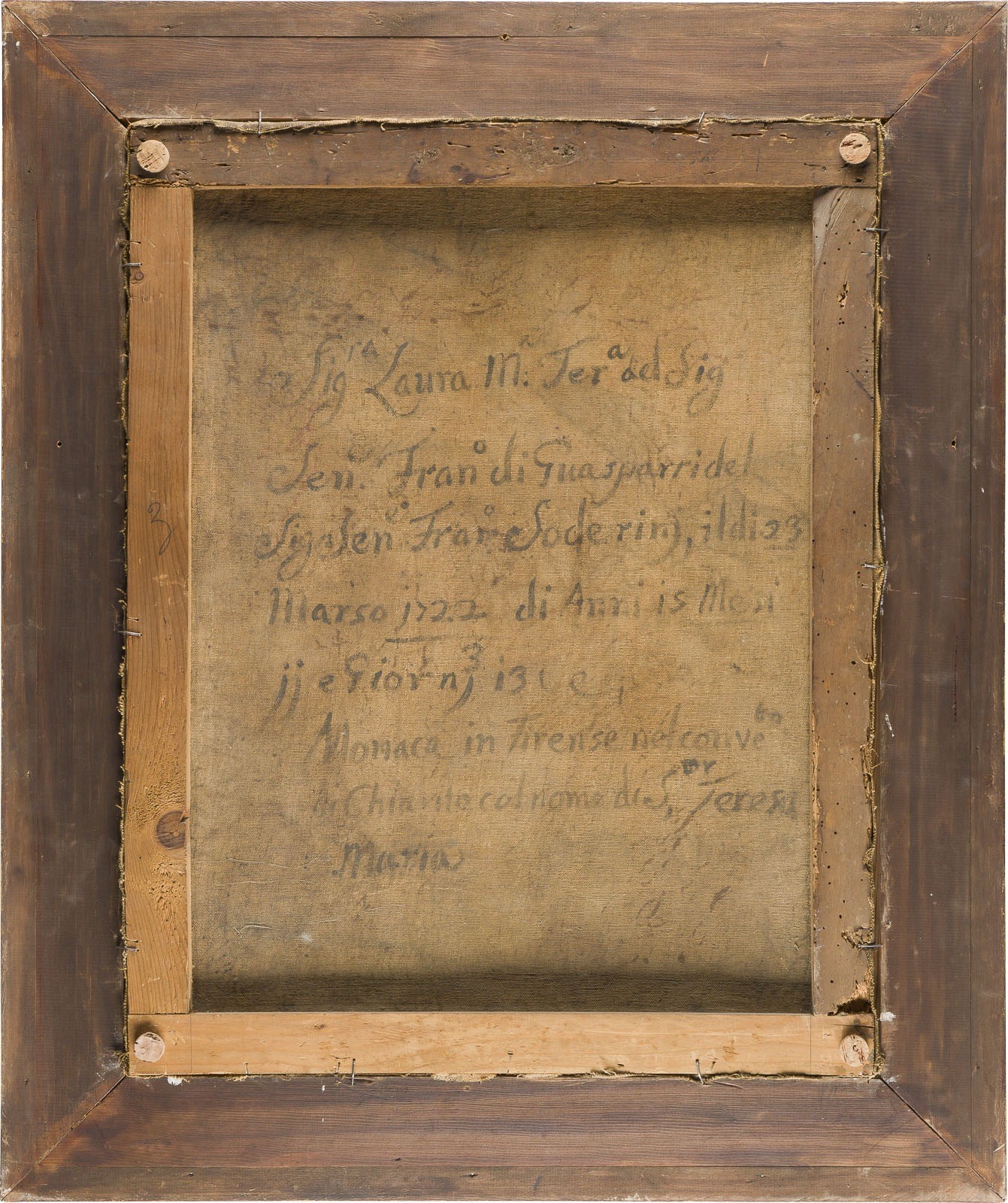 FLORENTINE SCHOOL, AROUND 1522 HALF-LENGTH PORTRAIT OF THE DAUGHTER OF FRANCESCO SODERINI (ENTERED THE CONVENT OF CHIAVELLO AS A NUN ON 3 MARCH 1522) Oil on canvas. 75 x 59.5 cm (F. 95 x 78 cm). On the reverse of the canvas inscribed: "Fig. Laura M. Terza de' Sig. Sen. Fran° di Sig. Guerride Figlio in Fran. Soderini, il dì 3 Marzo 1523 di Anni 15 Mesi ii Giorni 13 Almonaca in Firenze nel Convento di Chiavello col nome di Suor Teresa Maria" (depicting Laura M., third daughter of Senator Francesco di Sig. Guerride, daughter of Francesco Soderini, on 3 March 1522, aged 15 years, 2 months and 13 days, nun in Florence in the Convent of Chiavello under the name Sister Teresa Maria). Min. old rest., min. old retouching, surface soiled, imprint of the stretcher. Frame. Provenance: Hessian private collection.