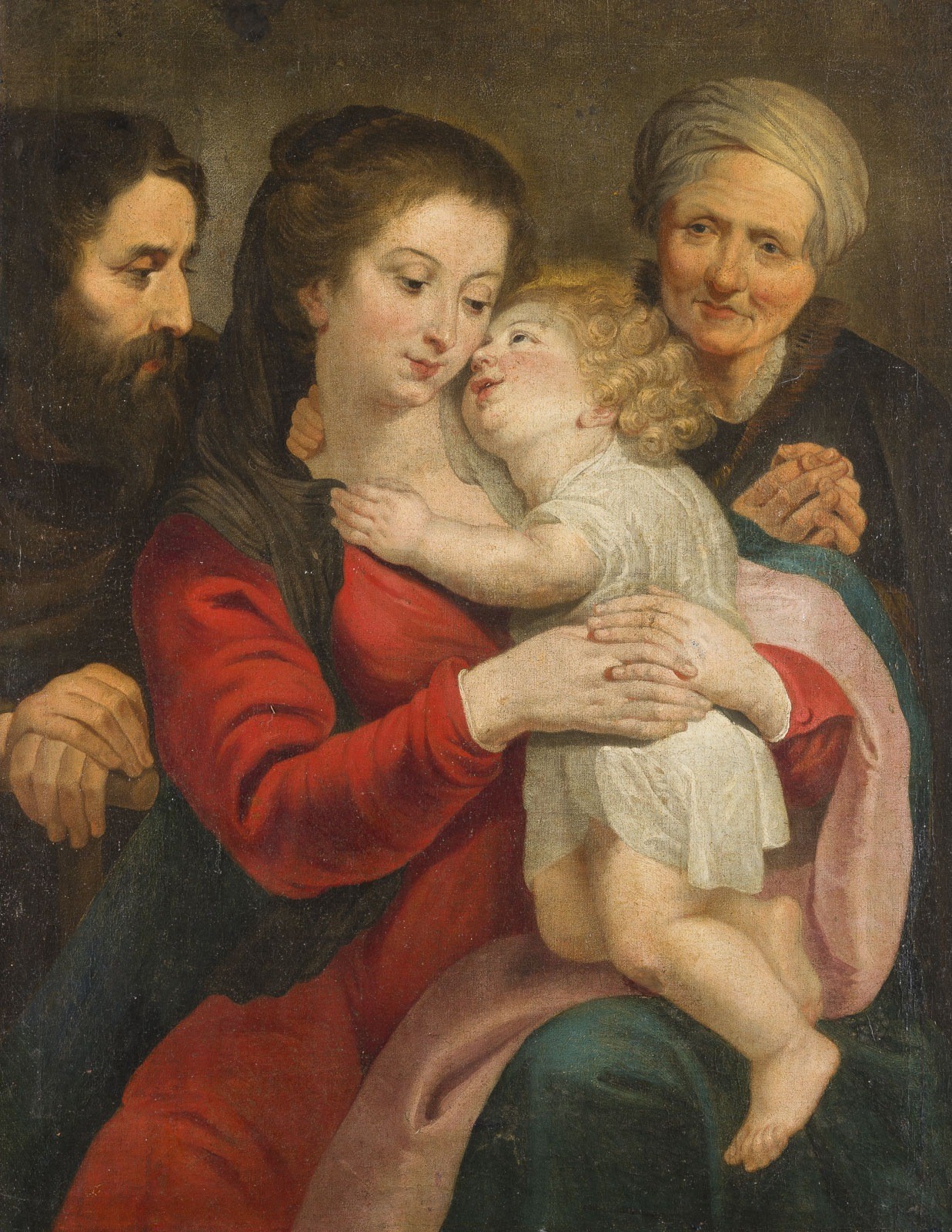 WORKSHOP OR SCHOOL OF PETER PAUL RUBENS 1577 Siegen - 1644 Antwerp HOLY FAMILY Oil on canvas (old relined). 103 x 78.5 cm. Min. old rest., old retouching. Provenance: Private collection, Rhineland.