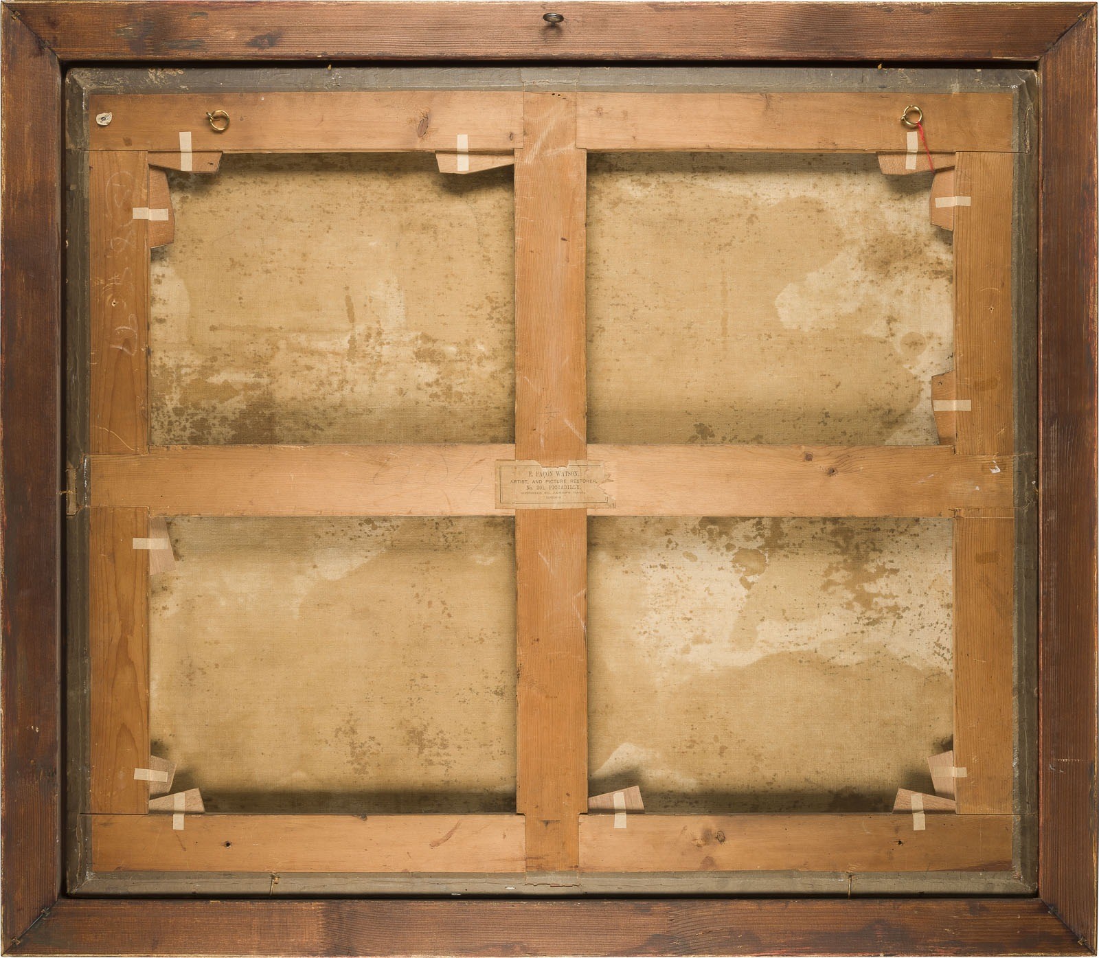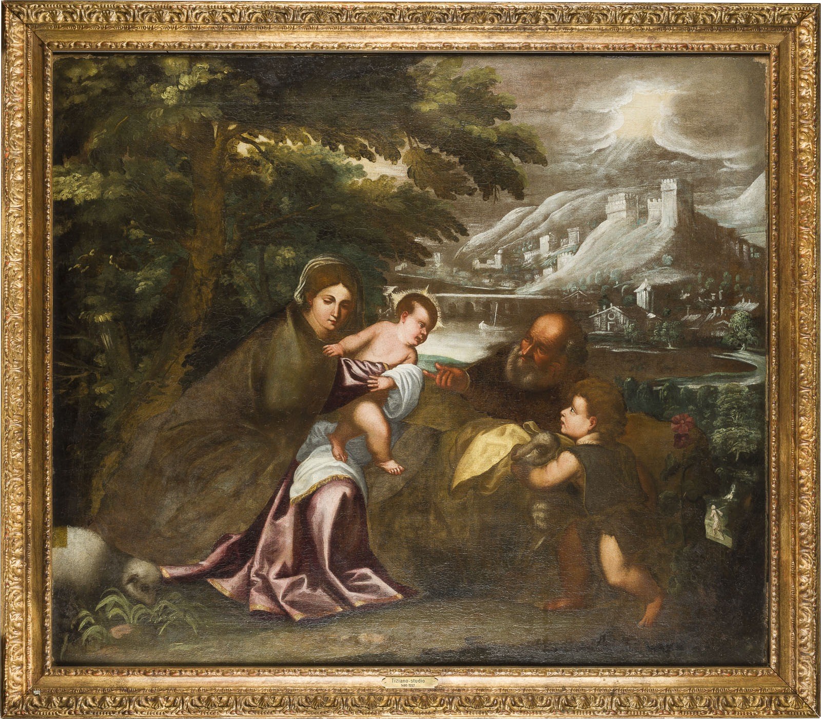 VENETIAN SCHOOL OF THE 16TH CENTURY HOLY FAMILY WITH SAINT JOHN THE BAPTIST Oil on canvas (old relined). 83 x 98 cm (F. 95.5 x 109.5 cm). Verso: inscribed on old paper label on stretcher: 'E. FACON WATSON ARTIST, AND PICTURE RESTORER. No. 201, PICCADILLY, OPPOSITE ST. JAMES'S HALL, LONDON. part slightly old rest., old retouching. Frame. Provenance: Rhenish private collection.
