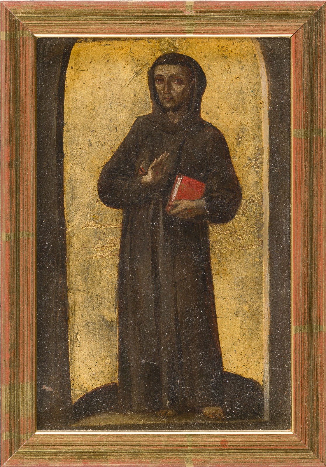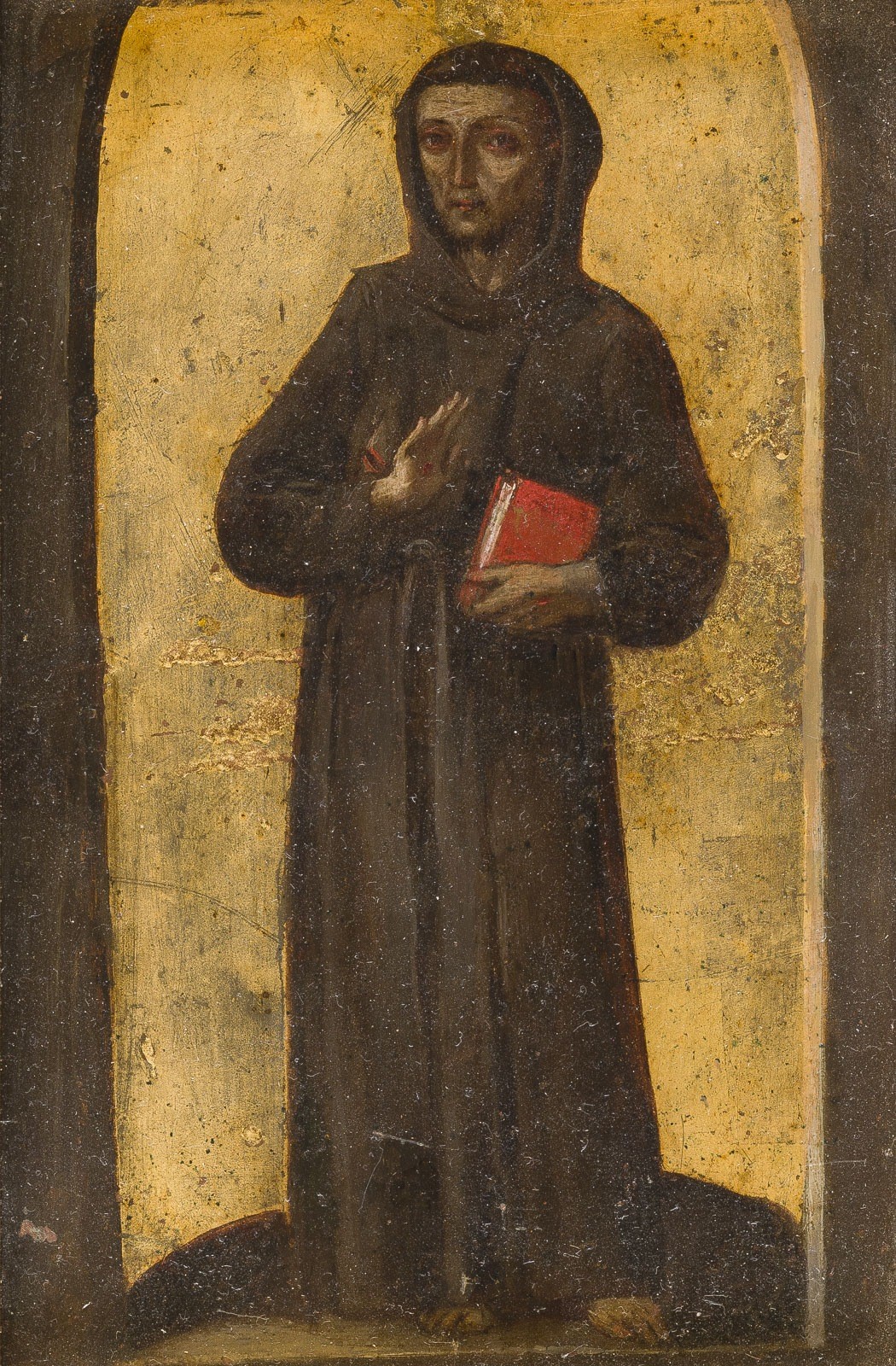 ITALIAN SCHOOL OF THE 15TH CENTURY SAINT FRANCIS OF ASSISI Oil on copper plate. Visible dimensions: 16 x 10 cm, frame dimensions: 19 x 13.5 cm. Partially damaged, retouching, loss of colour. Frame. Provenance: Private collection, Berlin.