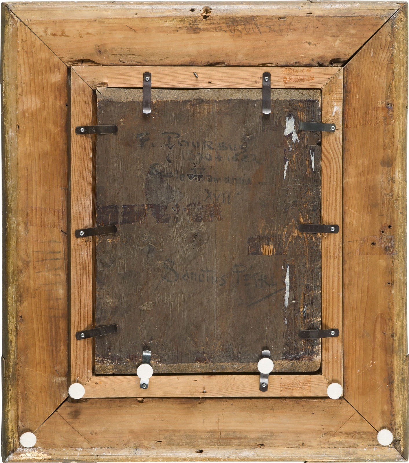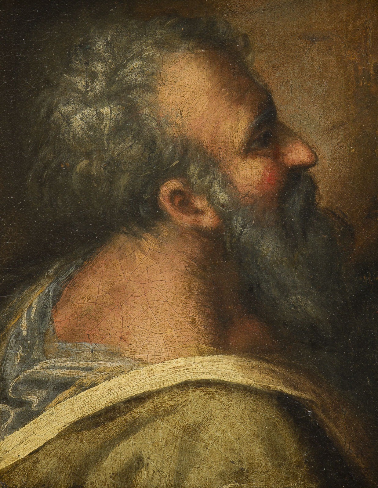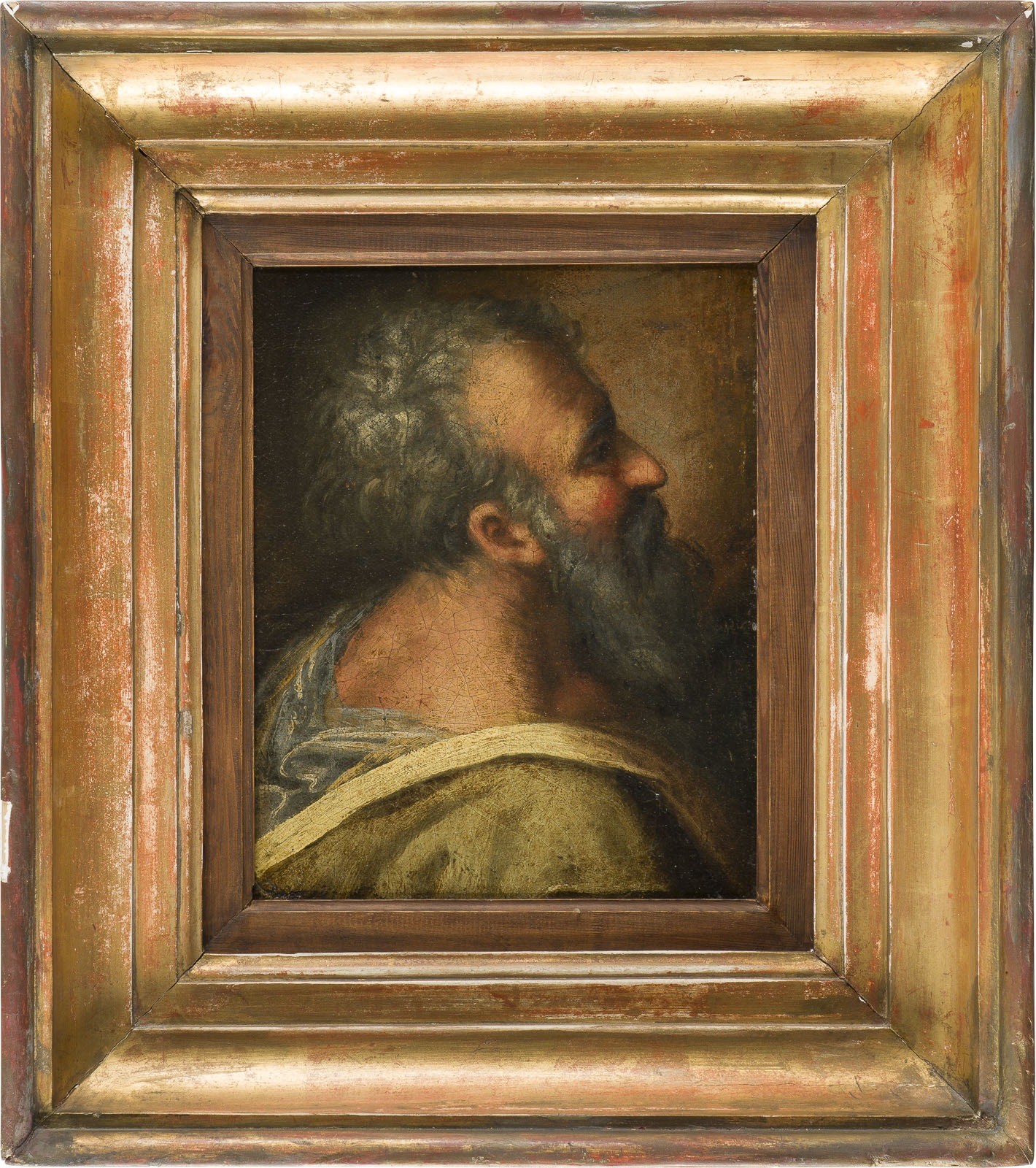 ITALIAN SCHOOL OF THE 17TH CENTURY SAINT PETER Oil on canvas laid on panel. 28 x 22 cm (F. 46.5 x 41 cm). Verso: on the panel inscribed "F. Pourbus 1570-1622 Ecole Flamande XVII 'Sanctus Petrus'". Min. old rest., min. old retouching, surface slightly soiled, edges min. rubbed. Frame. Provenance: Private collection, North Rhine-Westphalia.