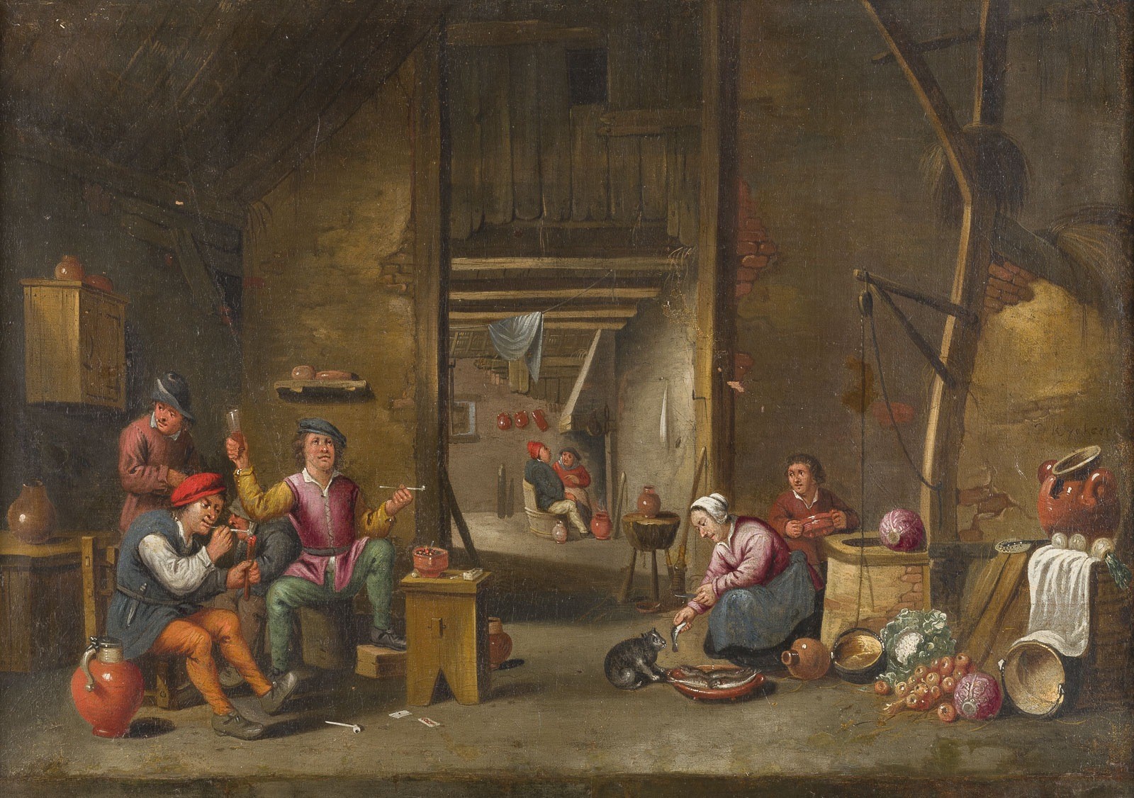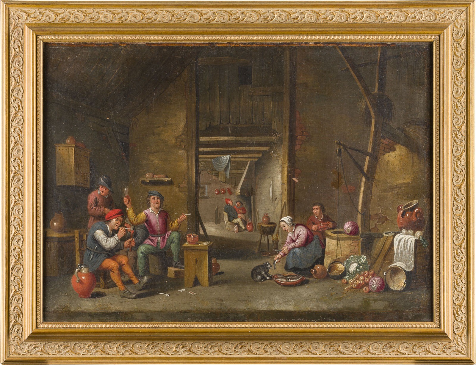 DAVID RYCKAERT (SCHOOL/CIRCLE) 1612 Antwerp - 1661 ibid IN THE PEASANT'S PARLOUR Oil on canvas (relined). 60 x 84 cm (F. 77.5 x 101 cm). Inscribed on the right centre: 'D.Ryckaert'. Part. slight old rest., min. old retouching, min. colour losses. Frame. Provenance: Private collection North Rhine-Westphalia.