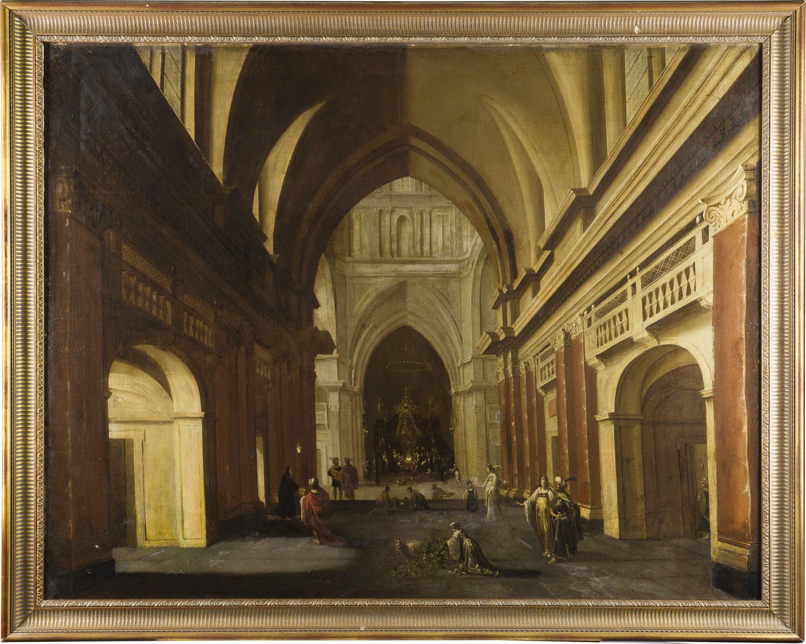 JAN JURIAENSZ (ALSO BANS OR HANS) VAN BADEN 1604 Steinbach - 1677 Amsterdam INTERIOR OF A PAGAN TEMPLE, WITH A SACRIFICE SCENE Oil on canvas (old relined). 99 x 127 cm (F. 114 x 141 cm). Remains of signature at bottom right: 'van B.den....'. Partly old rest., old retouching. Frame. Provenance: Rhenish private collection. Previously: Christie's Amsterdam Old Master Paintings auction, 2 December 1987, lot 180, illustrated.