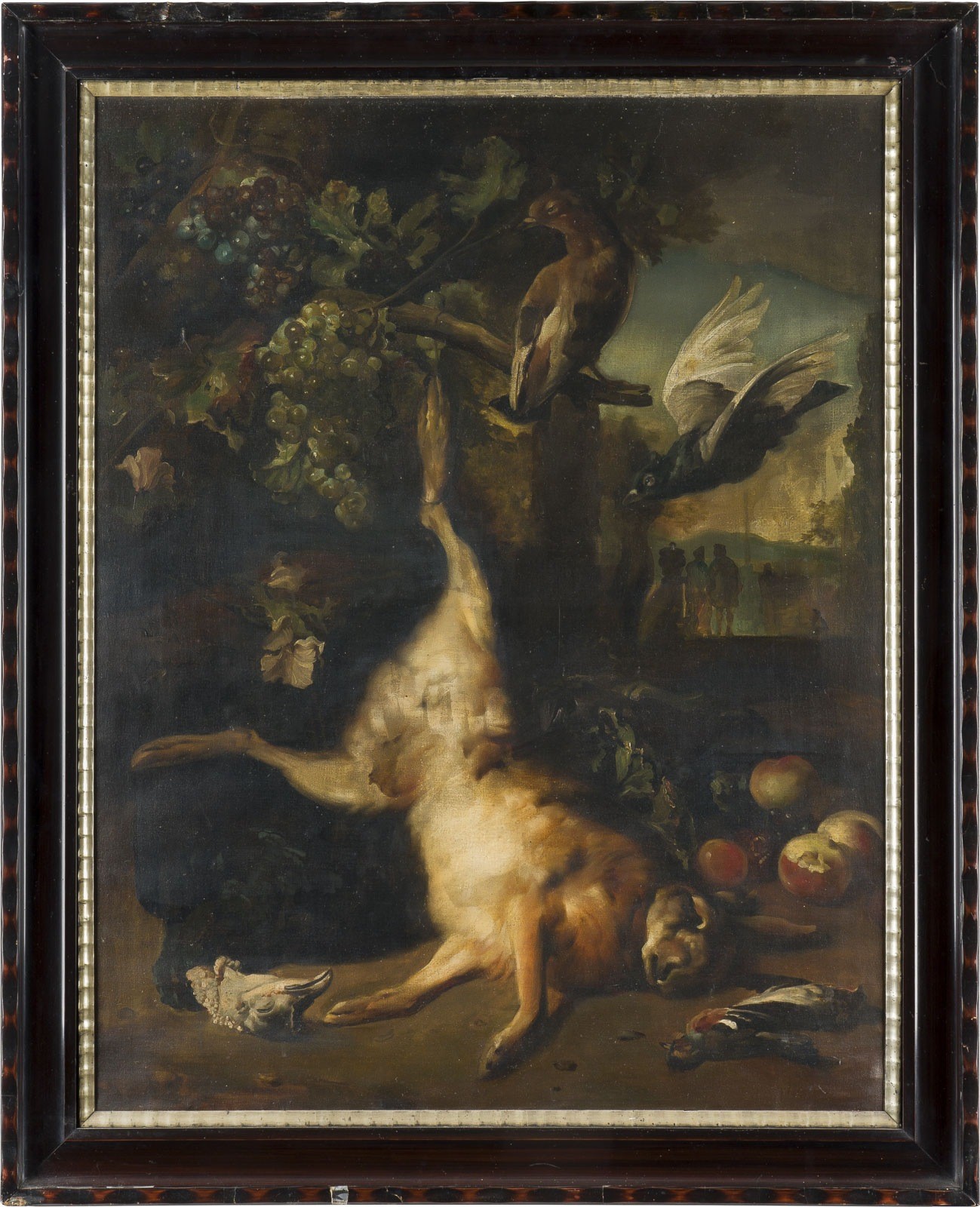 JAN WEENIX (FOLLOWER OF THE 19TH CENTURY) 1640 Amsterdam - 19 September 1719 ibid. HUNTING STILL LIFE WITH HARE Oil on canvas. 90.5 x 71 cm (F. 104.5 x 84 cm). Min. rest. Frame. Provenance: Hessian private collection.