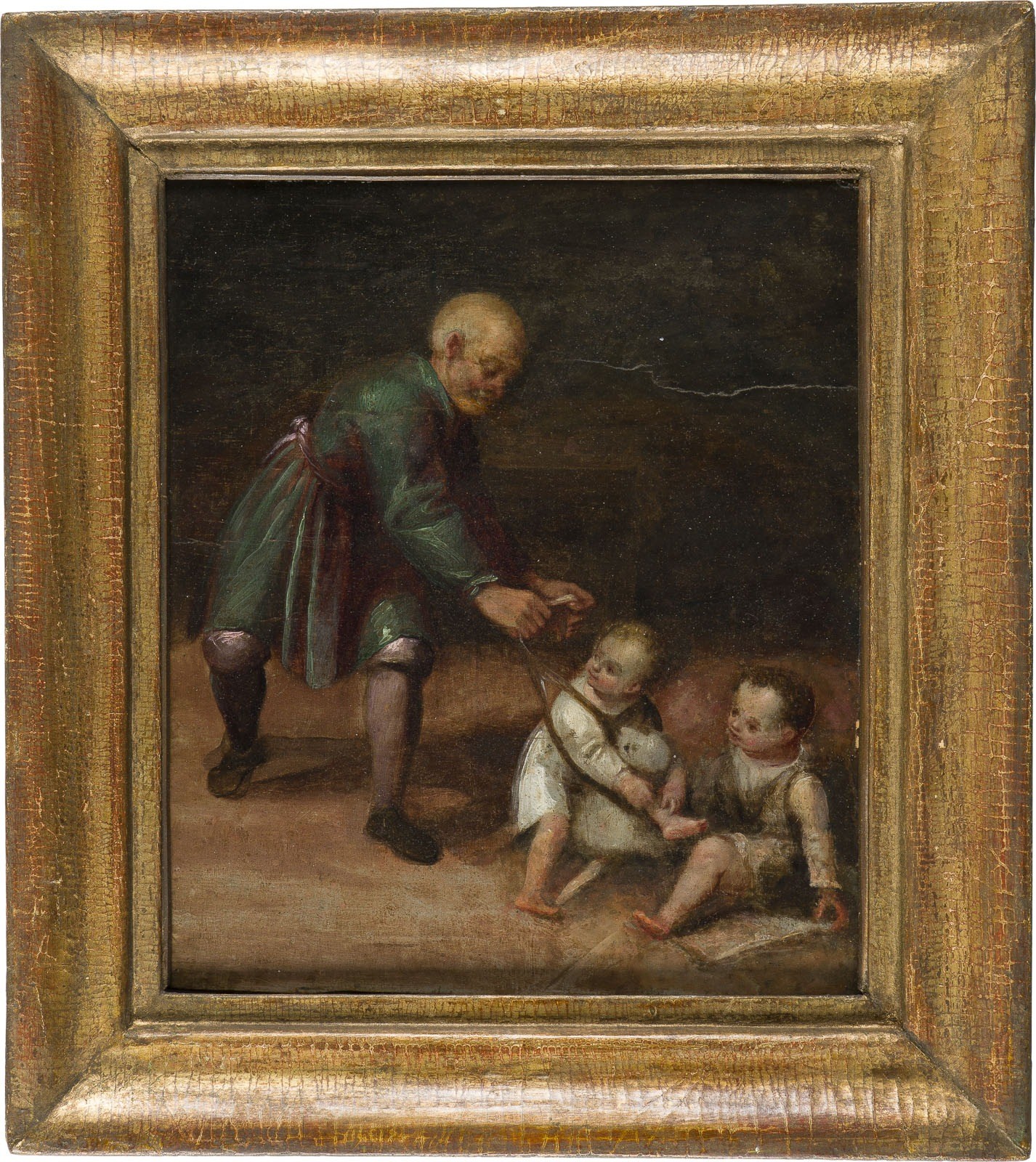 VITTORE CARPACCIO 1465 Venice - 1525 ibid. JOSEPH, JOHN AND JESUS Oil on panel (cradled). 27 x 23.5 cm (F. 38 x 34 cm). Possibly traces of an old signature lower centre (indistinct). Literatur: Study by Vittore Carpaccio of Joseph cf. Italienische Zeichnungen 15.-18. Jahrhundert, Staatliche Graphische Sammlung München, Ausstellung vom 4. Mai bis zum 6. August 1967, München 1967, siehe Tafel 9, Kat. 20. Part. old rest., part. min. old retouching. Frame. Provenance: International private collection.