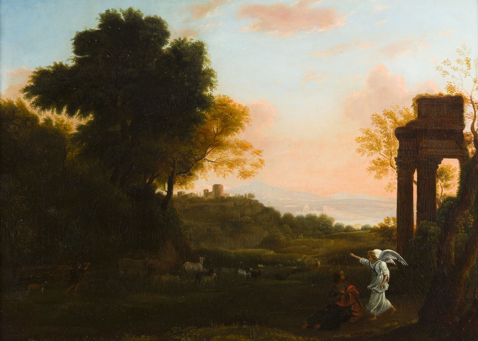 PROBABLY FOLLOWER OF CLAUDE LORRAIN IN THE 18TH CENTURY 1600 Chamagne - 21 November 1682 Rome LANDSCAPE WITH HAGAR AND THE ANGEL (AROUND 1654) Oil on canvas. 58 x 79 cm (R. 68 x 90 cm). Part. slightly old rest., min. old retouching. Frame. Provenance: Private collection, Rhineland.