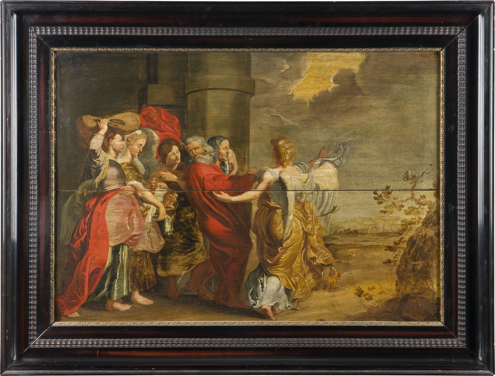 PETER PAUL (ALSO PIETER PAUWEL) RUBENS (CIRCLE/SCHOOL) 28 June 1577 Siegen - 30 May 1640 Antwerp LOTH FLIES FROM SODOM WITH HIS DAUGHTERS Oil on oak panel. 57 x 82 cm (F. 76 x 100 cm). Min.rest., min. old retouching, continuous horizontal tension crack. Frame. Provenance: South German private collection.