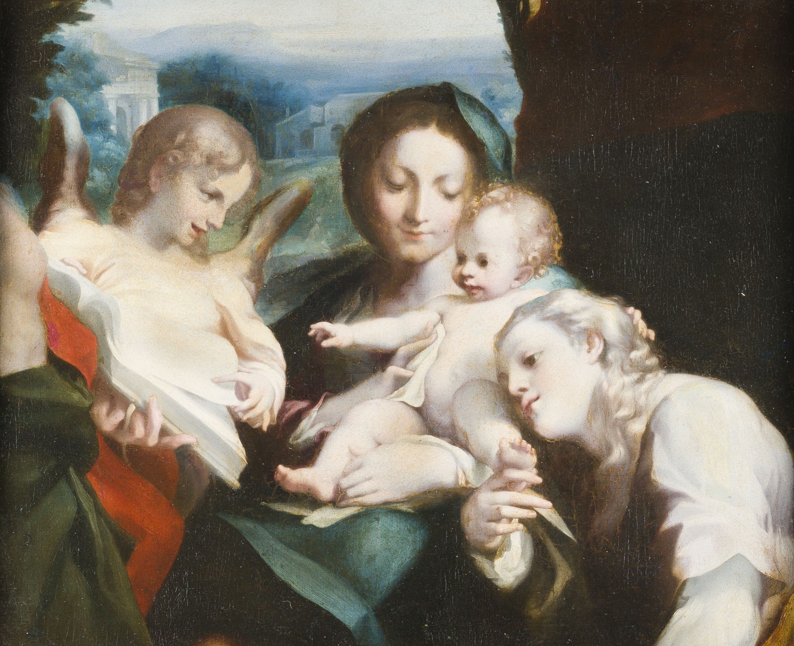 ANTONIO DA CORREGGIO (ALSO ALLEGRI) (PROBABLY SCHOOL) 1489 Correggio - 1534 ibid MADONNA OF SAINT JEROME Oil on canvas (relined). 81 x 96 cm (F.104.5 x 122 cm). Old rest., old retouching, shrinkage craquelure, dirty surface. Frame. Provenance: Private collection, North Rhine-Westphalia.