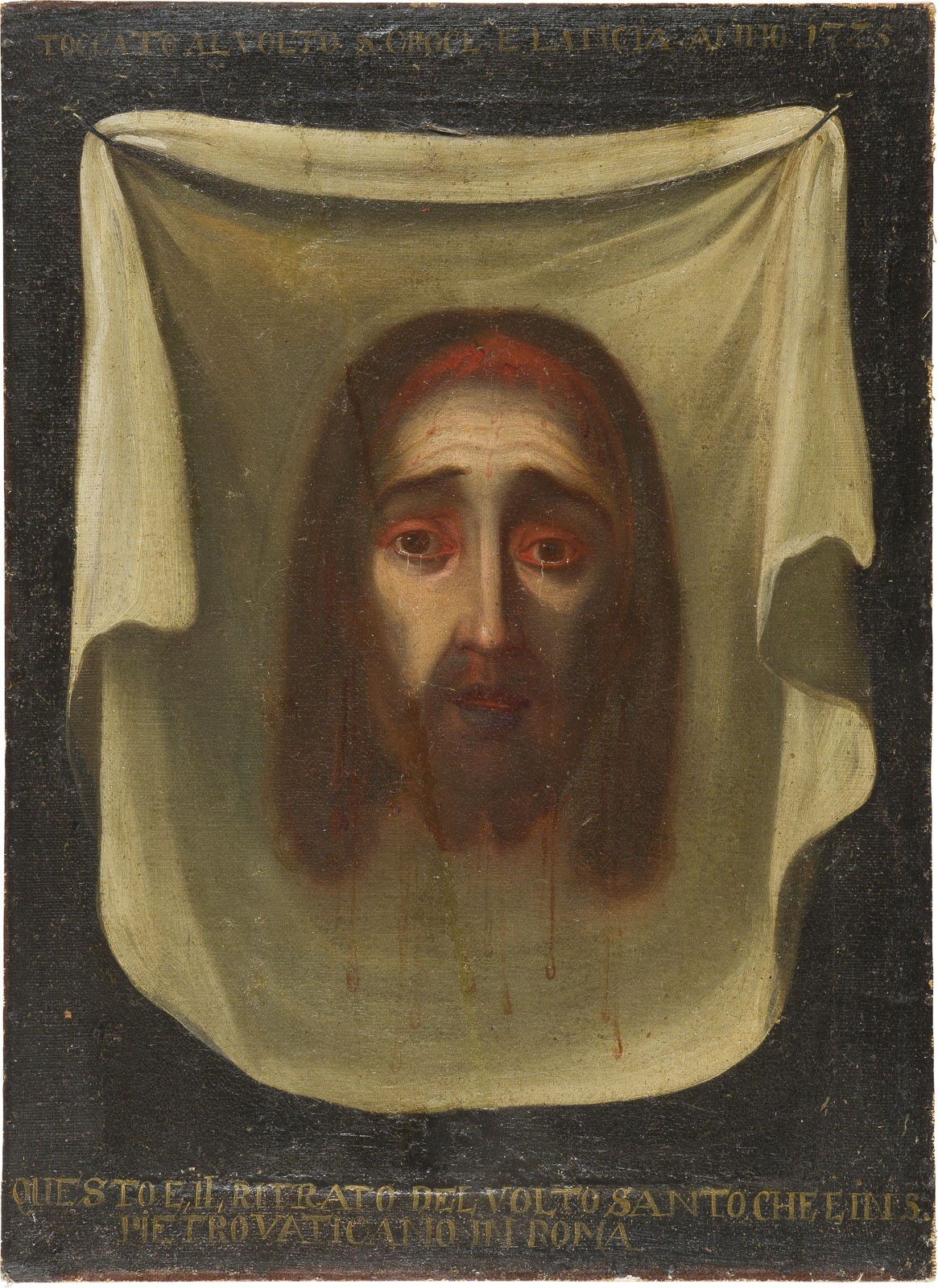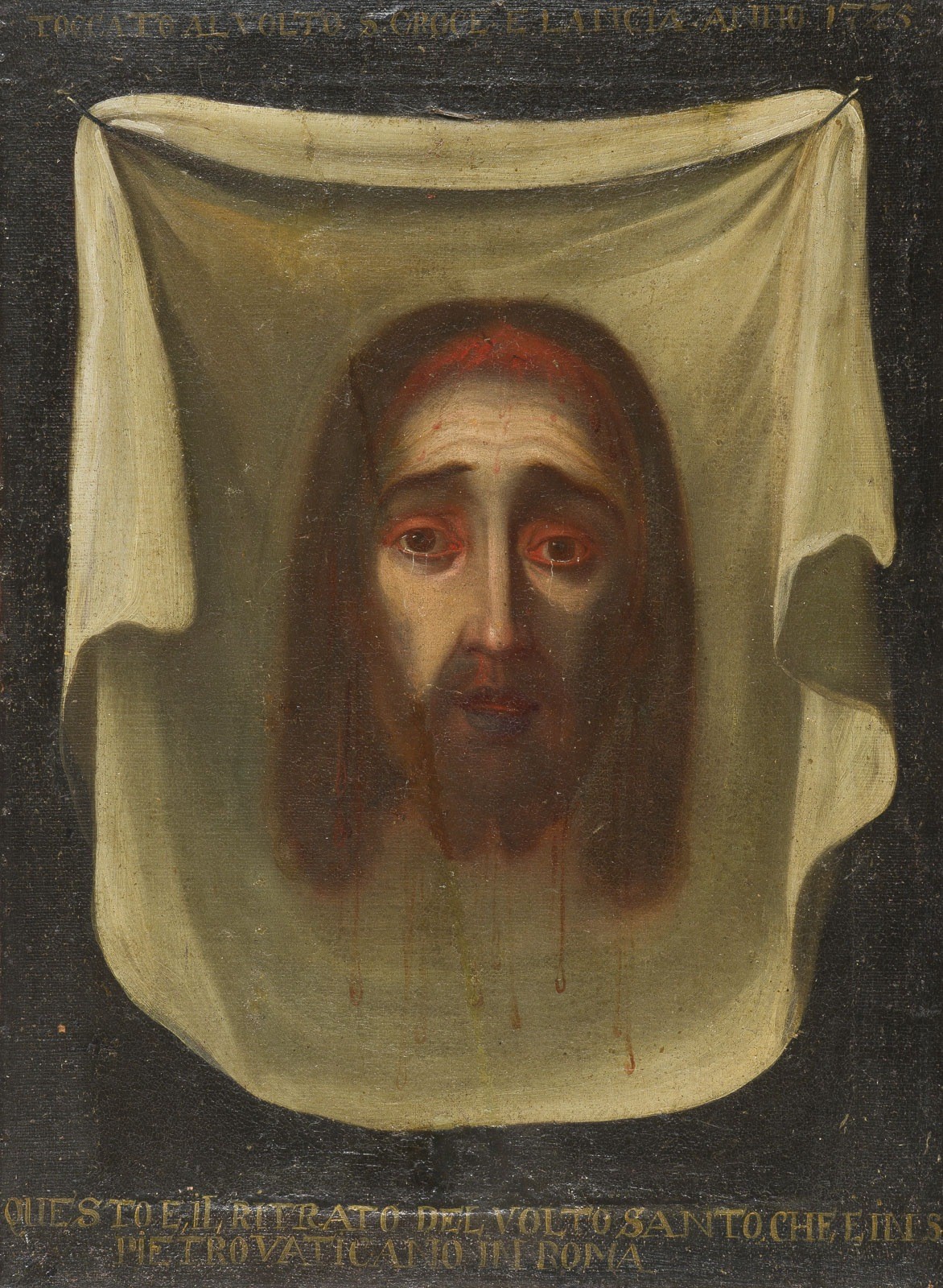 NEAPOLITAN-SPANISH SCHOOL, DATED 1725 MANDYLION CHRIST Oil on canvas, mounted on stretcher. 65 x 47 cm. On the painting, extensive inscription and date above and below: Anno 1725. Min. rest., old retouching. Provenance: Rhenish private collection.