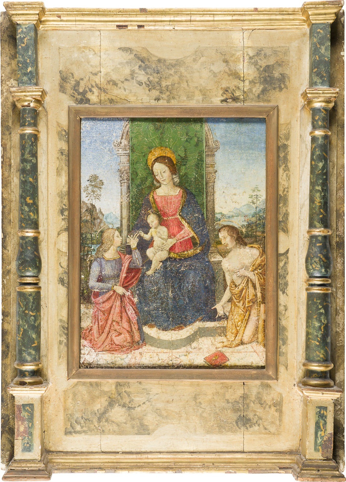 PIETRO PERUGINO (CIRCLE / FOLLOWER) 1446 Città della Pieve - 1523 Fontignano MADONNA AND CHILD, FLANKED AT RIGHT BY JOHN THE BAPTIST AND AT LEFT BY SAINT CATHERINE Tempera on poplar panel (cradled). 87.5 x 65 cm. Pinpoint paint losses across the surface, part. old rest., old retouching, rubbed. Frame probably of the 18th century, in the Renaissance style. In a calm and balanced composition, the painting depicts the Madonna with the Christ Child, flanked by Saint Catherine and John the Baptist, set before an architectural structure and an expansive, light-filled landscape. The gently idealised faces, the lowered gaze of the Virgin, as well as the harmonious colouring and clear arrangement of the figures are closely related in style to the Umbrian-Florentine Early Renaissance, and in particular to the work of Pietro Perugino and his circle. The painting conveys a timeless, contemplative devotion and follows the classical type of the Sacra Conversazione, in which Catherine of Alexandria, as a symbol of her spiritual bond with God, offers or receives a ring from the Christ Child. Provenance: Private collection, Amsterdam.