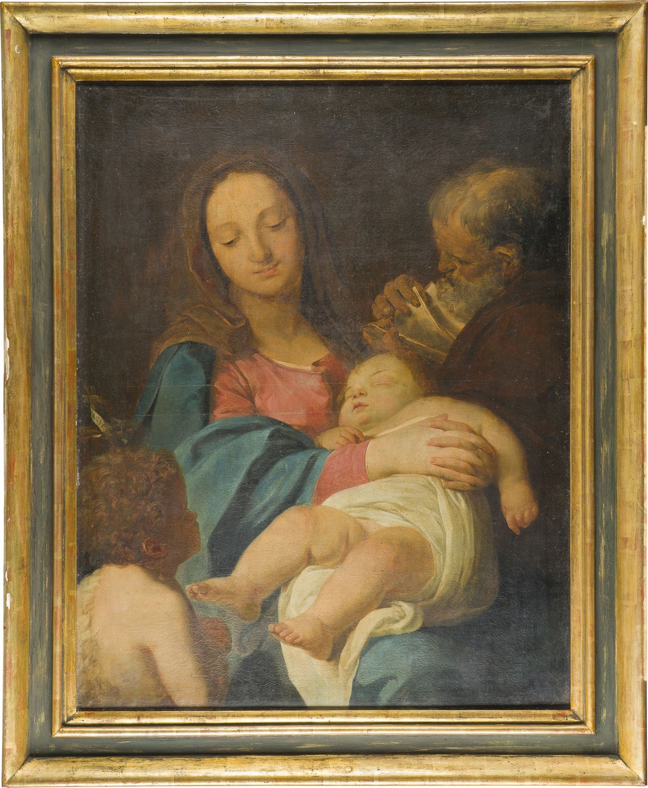 GIOVANNI BATTISTA TAGLIASACCHI August 26, 1696 Borgo San Donnino - December 3, 1737 Castelbosco MARY WITH THE SLEEPING CHILD JESUS, SAINT JOSEPH, AND SAINT JOHN THE CHILD Oil on canvas (old relined). 92.5 x 72 cm (F. 110.5 x 90.5 cm). Min. old rest., min. old retouching. Frame. In quiet, heartfelt devotion, the Mother of God appears with the sleeping Christ Child, whose body rests almost horizontally across her arms. Saint Joseph emerges from the semi-darkness and gazes at the child in reserved contemplation, while the little John the Baptist in the foreground points to the Passion with his cross staff. The soft, velvety modeling of the flesh tones, the delicately blurred transitions in Mary's face, and the lyrical tranquility of the composition clearly refer to early 18th-century Bolognese painting. Stylistically, the work is closely related to Carlo Cignani, whose classicist idealization is transformed here into a more personal, sensitive visual language. The warm tones, the intimate contemplation of the figures, and the almost weightless positioning of the child are particularly indicative of the hand of Giovanni Battista Tagliasacchi, a close friend and artistic companion of Cignani. The painting is likely to have been created in the first third of the 18th century. A sensitive devotional painting of great tranquility and poetic coherence. Provenance: Private collection, Hesse.