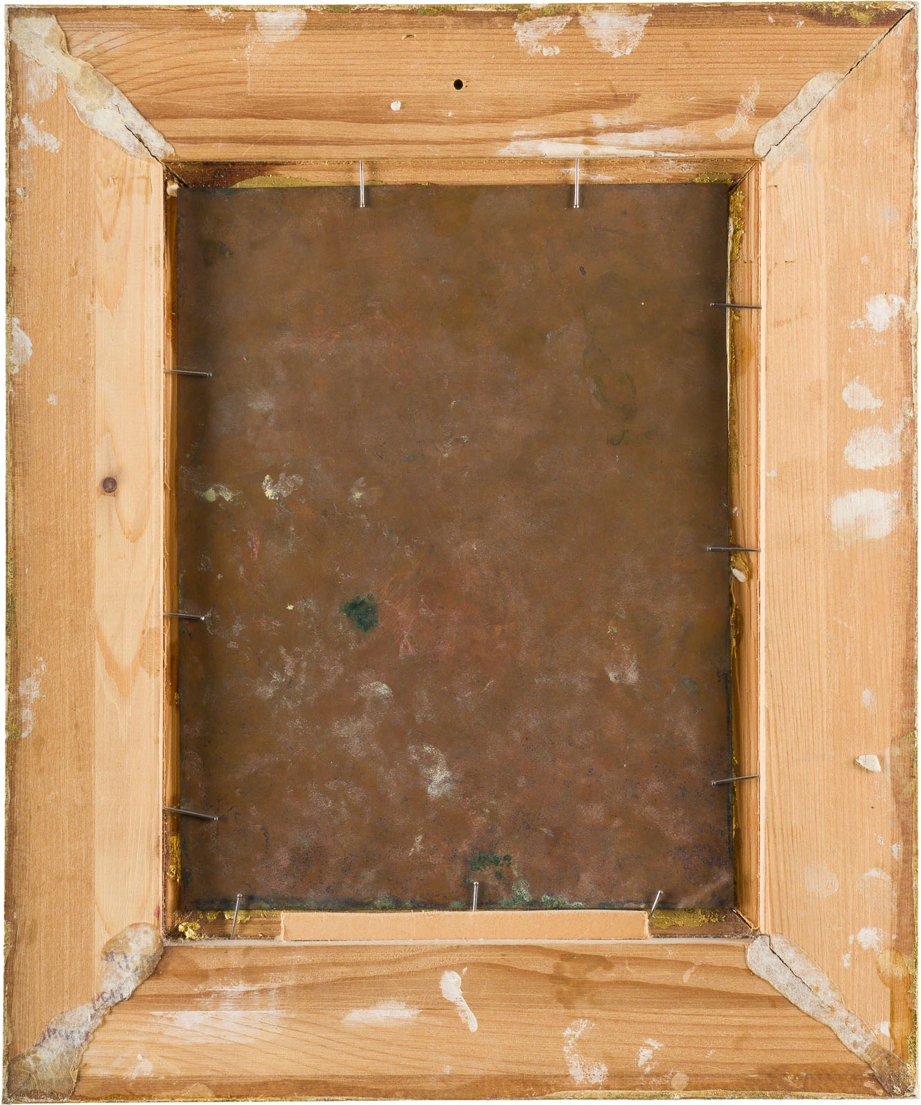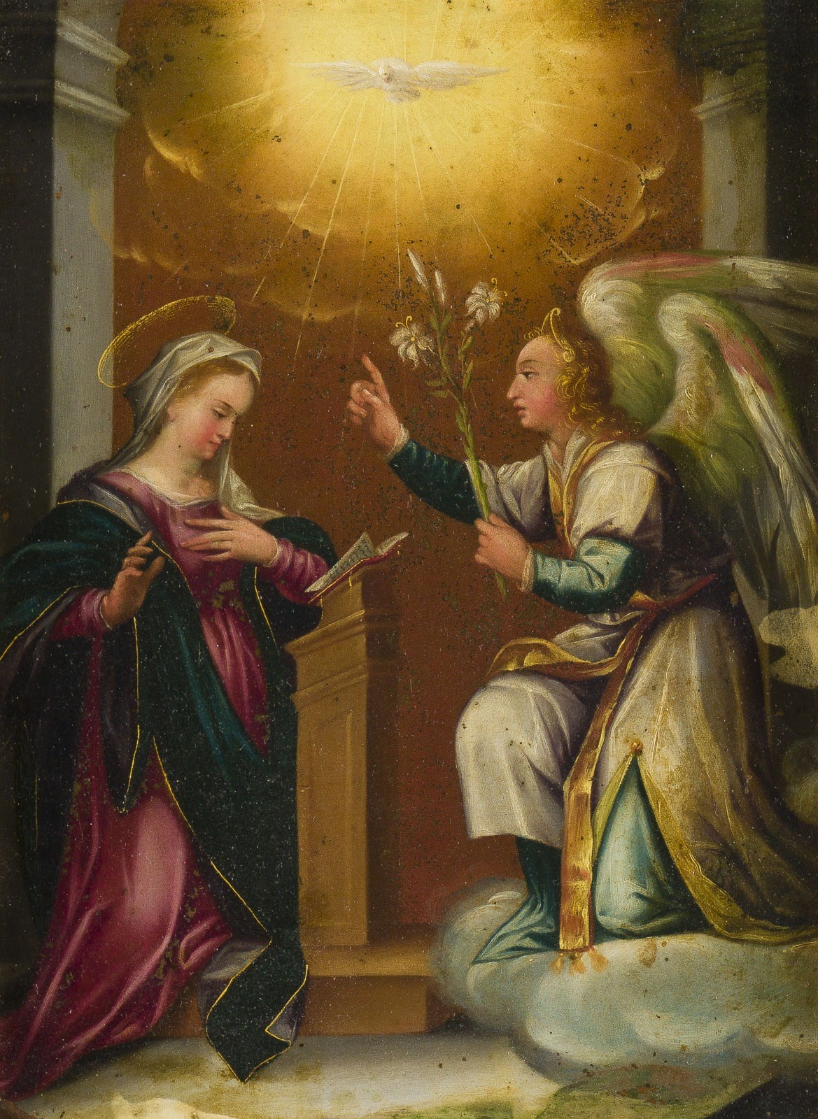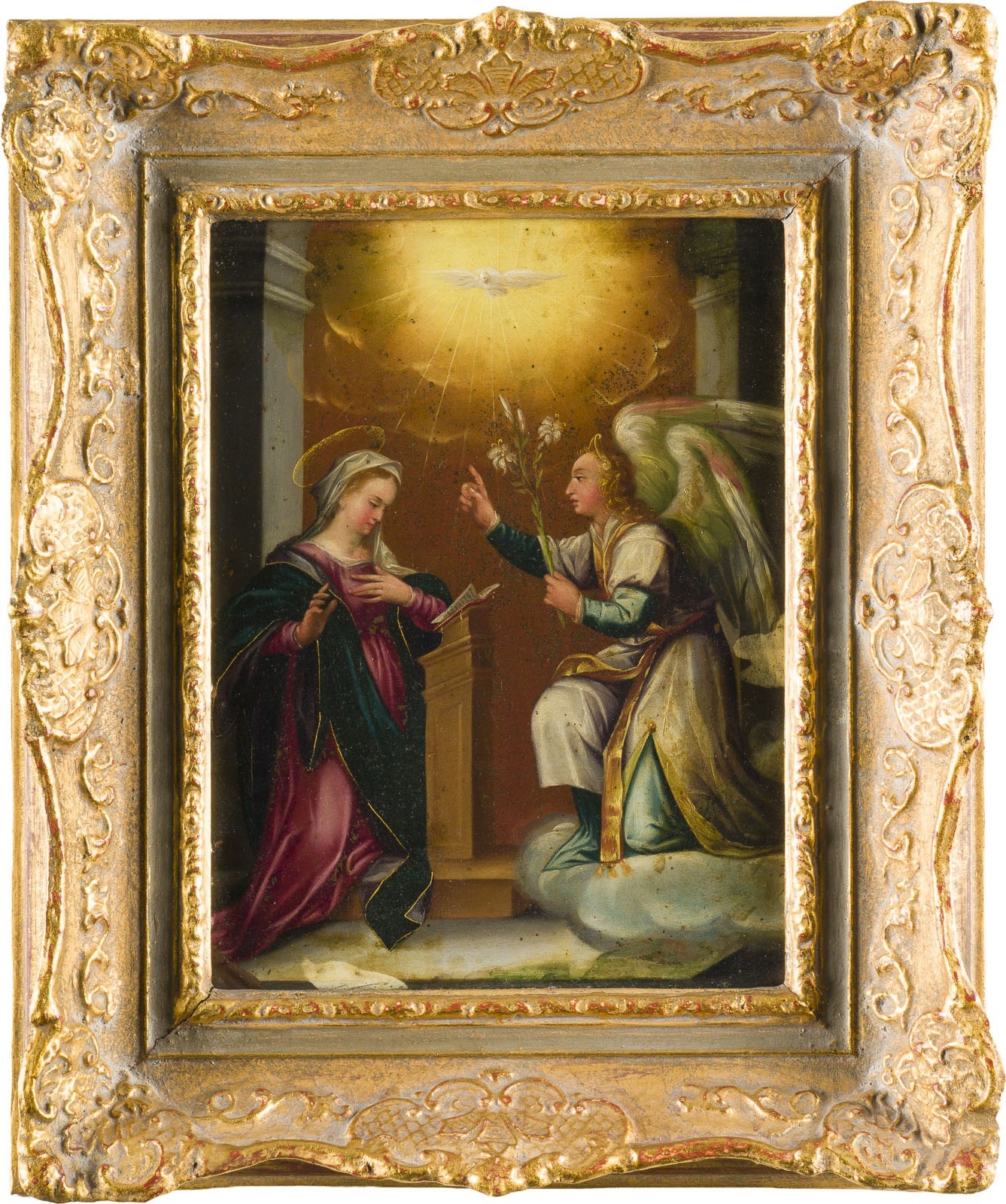 ITALO-FLEMISH SCHOOL, CIRCA 1700 ANNUNCIATION Oil on copper plate. 22.5 x 17.5 cm (F. 34 x 28.5 cm). Old rest., old retouching, loss of colour, dirty surface. Frame. Provenance: Private collection, North Rhine-Westphalia.