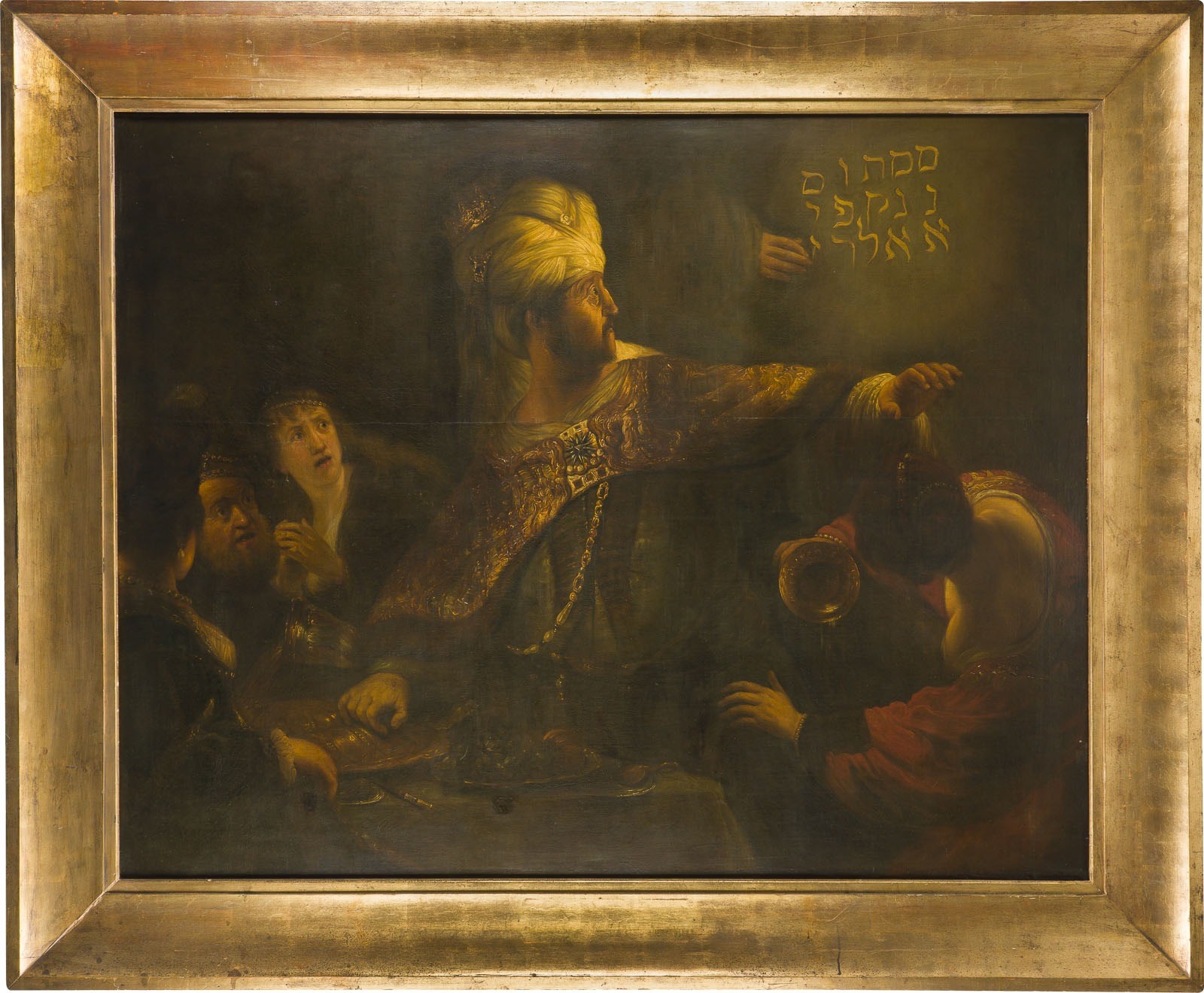 HPROBABLY STUDIO OF HARMENSZ. VAN RIJN REMBRANDT 1606 Leiden - 1669 Amsterdam MONUMENTAL PAINTING: THE FEAST OF BELSAZAR Oil on canvas (old relined). 164 x 207 cm (F. 203 x 248 cm). Partially min. old rest., minimal old retouching. Frame. Provenance: Private collection, Rhineland.