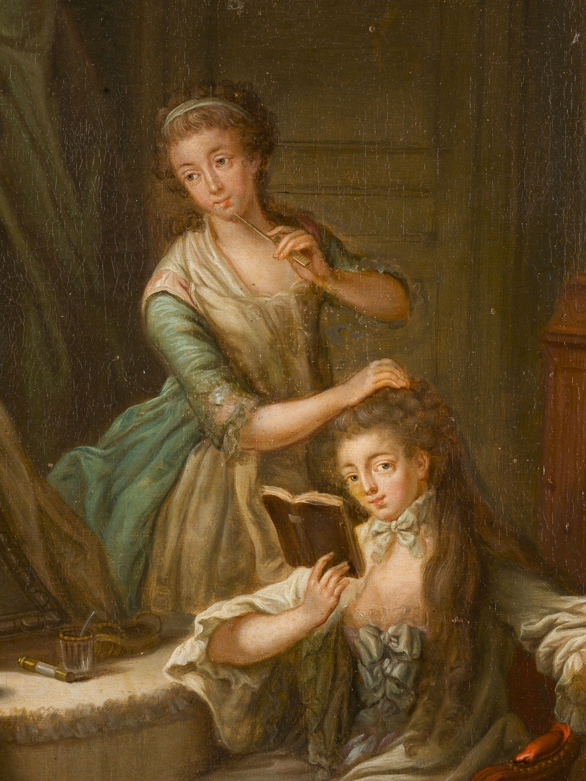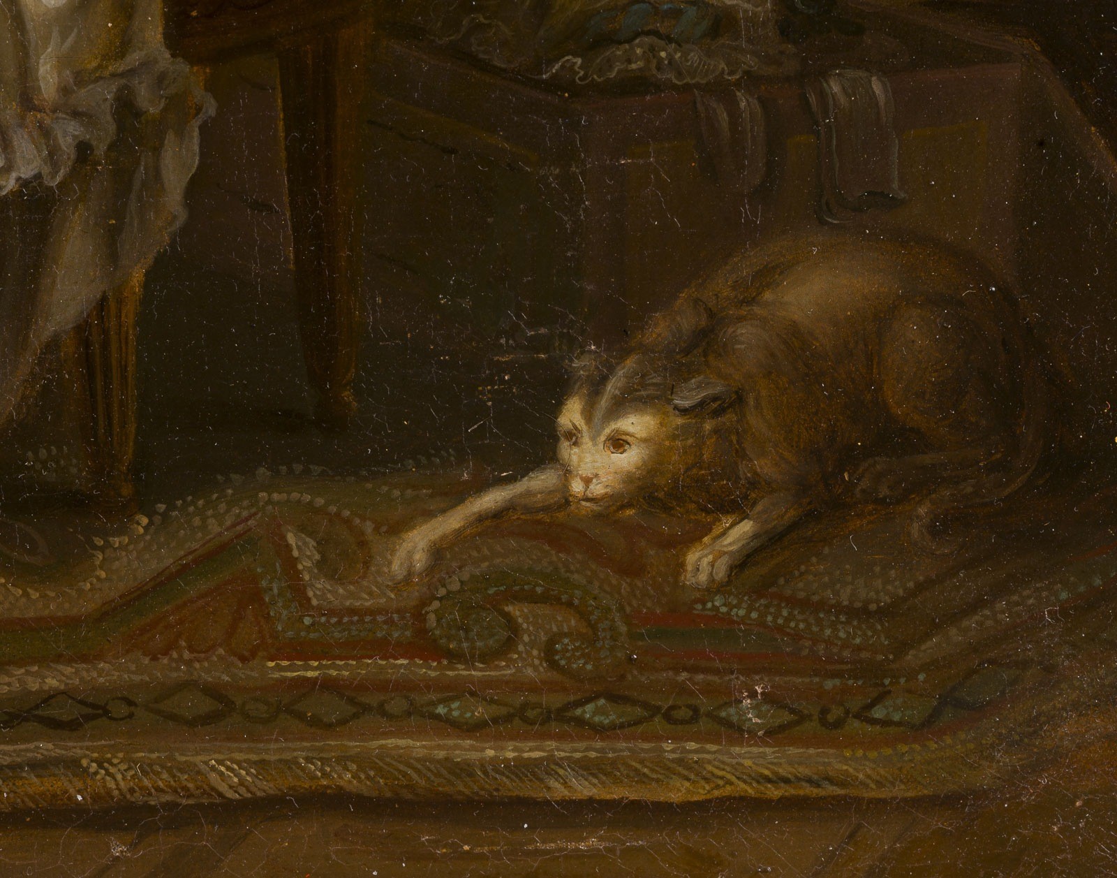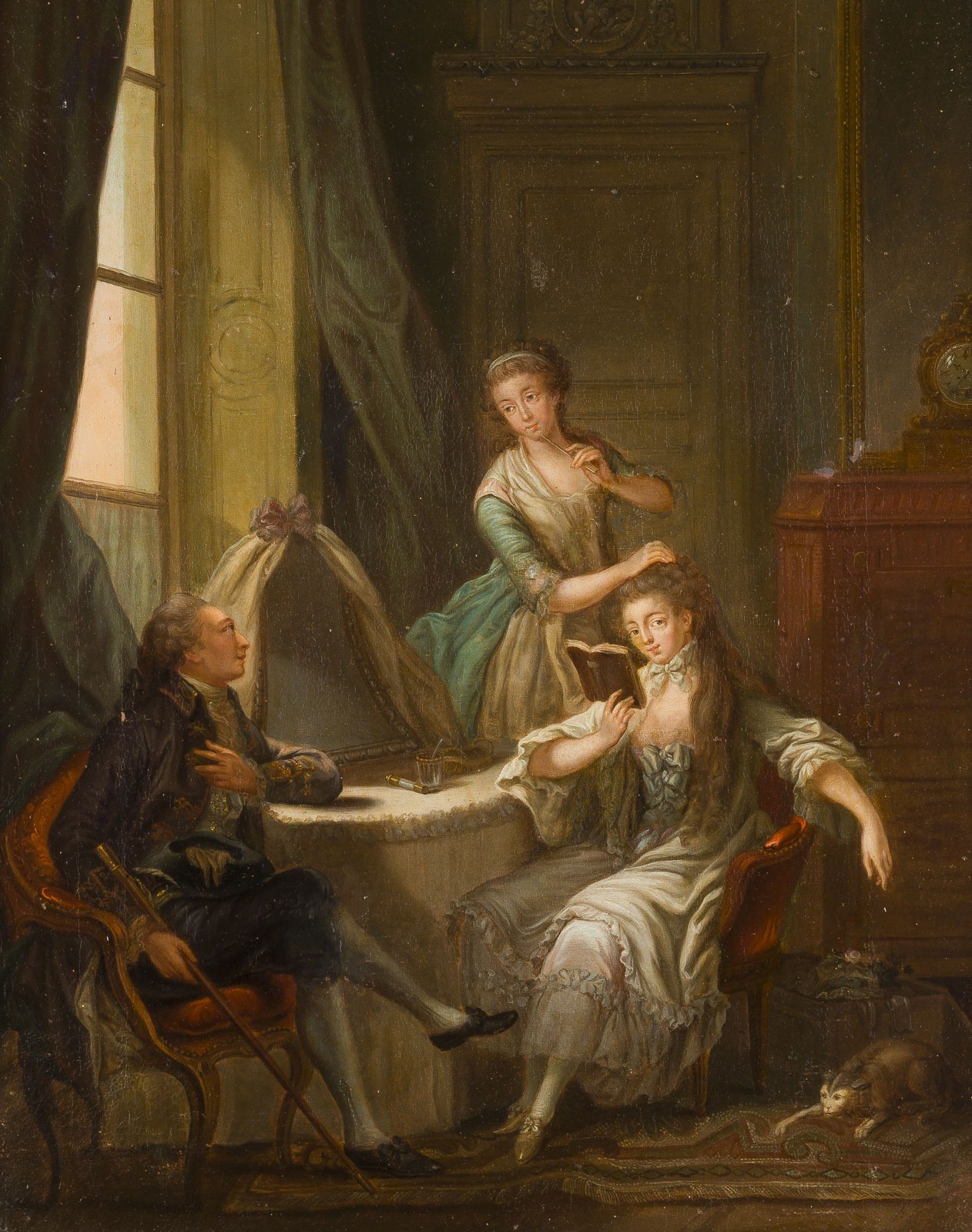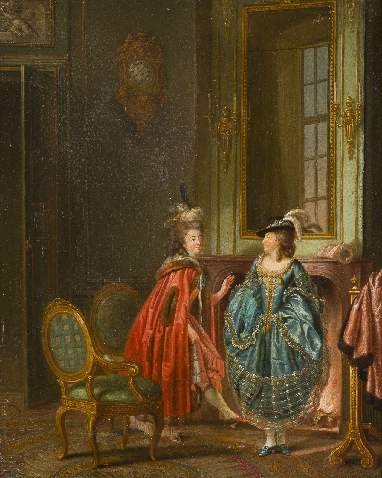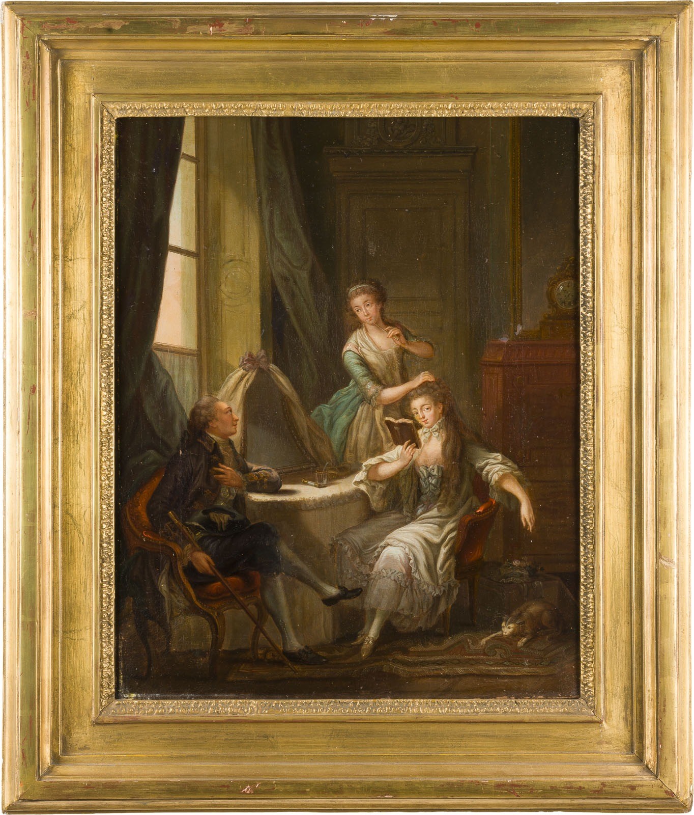 JOHANN HEINRICH TISCHBEIN THE YOUNGER 28 November 1742 Haina (monastery) - 22 December 1808 Kassel PAIR OF PAINTINGS: INTIMATE MOMENT IN THE SALON / THE GALANT CONVERSATION Oil on canvas. Both: 49.5 x 40 cm (F. 66 x 57 cm). Each: monogrammed "HT" lower left and lower centre respectively. Part. min. old rest., min. old retouching, marginal areas with minor loss of colour. Frame. Provenance: International private collection.