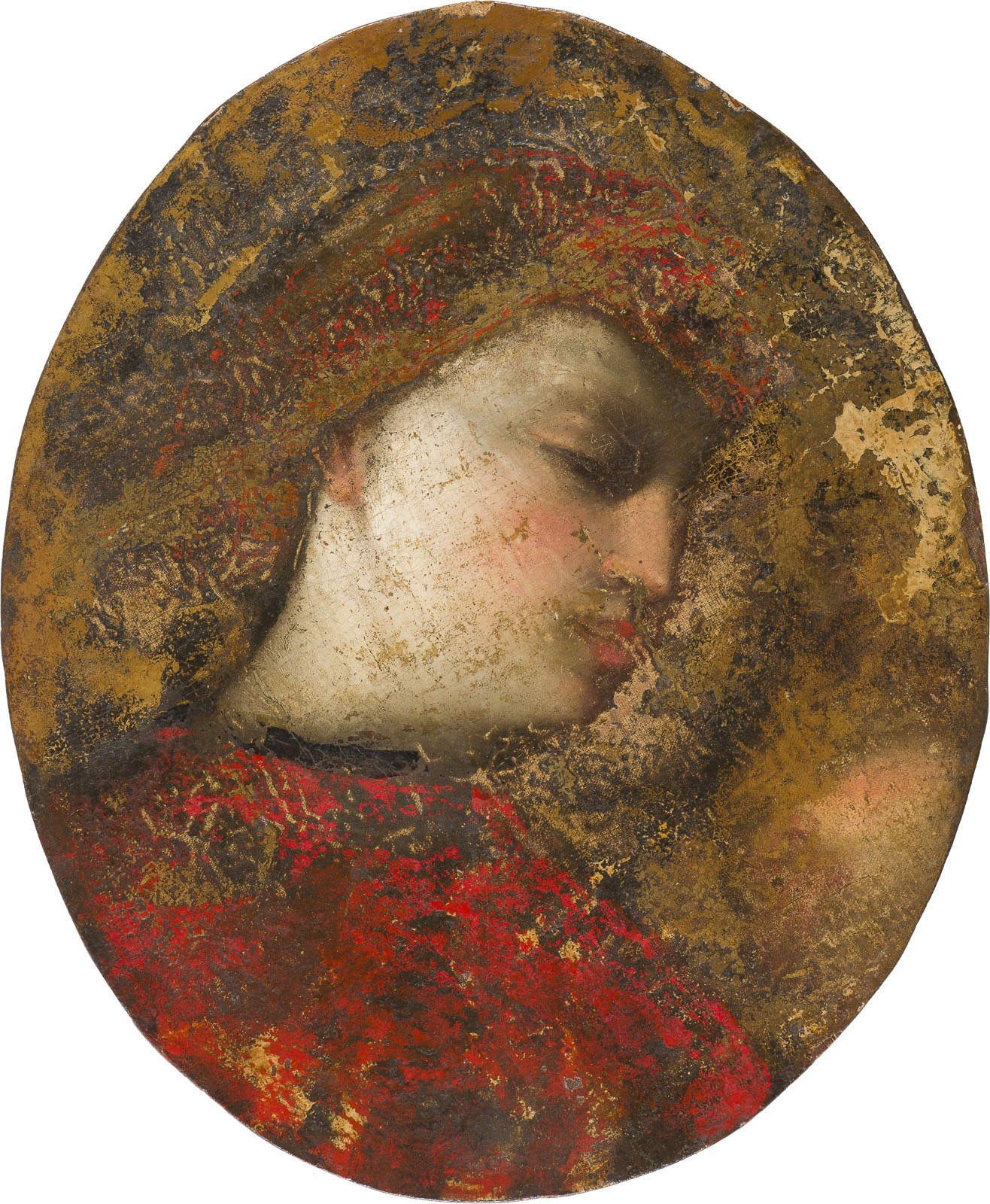 ITALIAN SCHOOL OF THE PROBABLY 16TH CENTURY PROFILE BUST PORTRAIT OF A YOUNG WOMAN WITH RED GARMENT AND BONNET Oil on canvas laid on panel (oval). 46.5 x 38 cm. Extensive paint losses, old rest., trimmed. Provenance: Private collection, North Rhine-Westphalia.