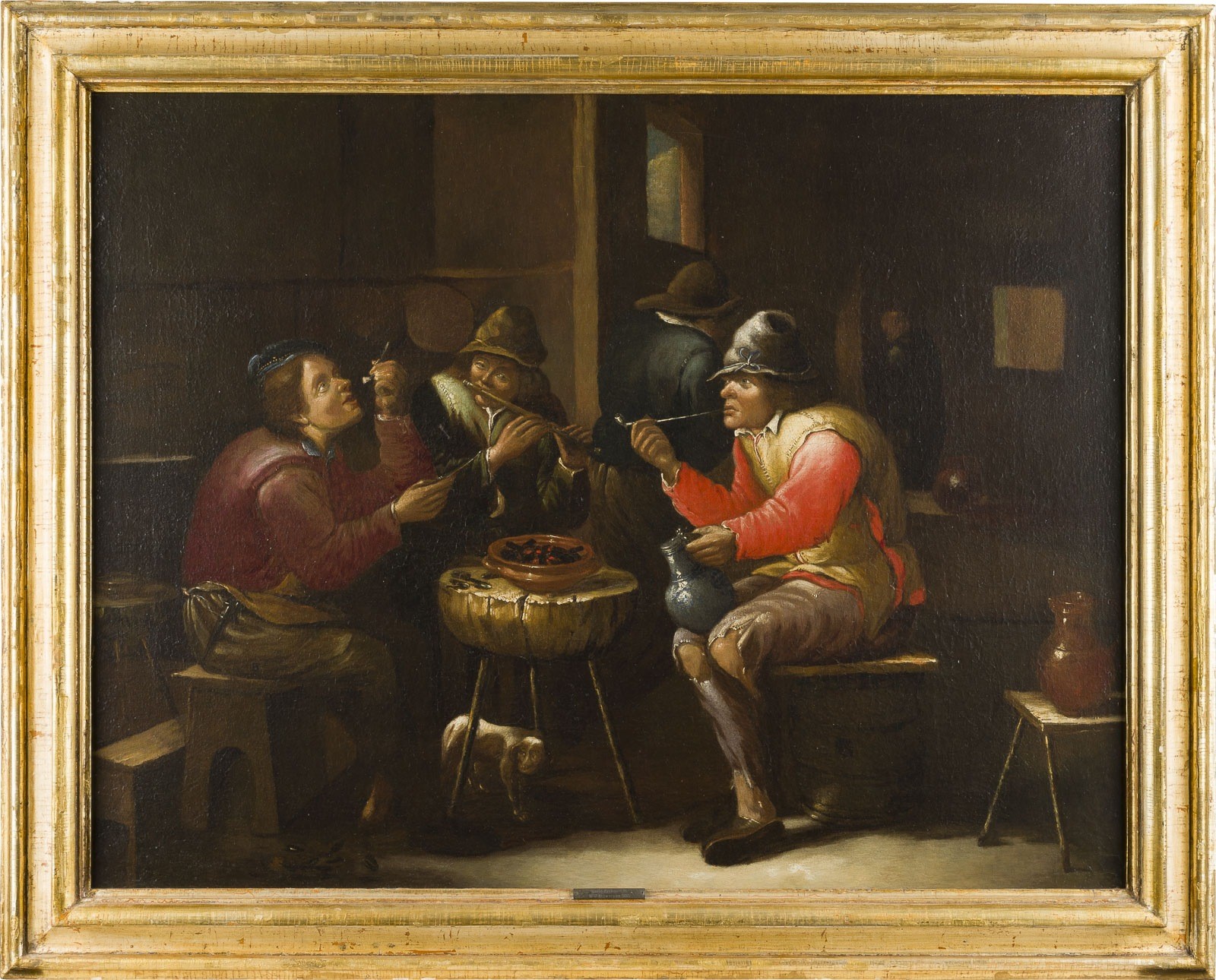 DAVID RYCKAERT (SCHOOL/CIRCLE) 1612 Antwerp - 1661 ibid SMOKING AND MAKING MUSIC IN THE FARMHOUSE PARLOUR Oil on canvas (relined). 57.5 x 74 cm (F. 69 x 86 cm). Verso: old paper label with name, lifetime and career of the artist and reference to galleries. Part rest., old retouching. Frame. Provenance: North German private collection.