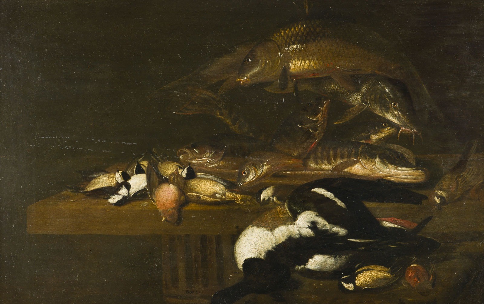 STILLLEBEN MIT KARPFEN, HECHT, BARSCH, BARBE UND VÖGELN