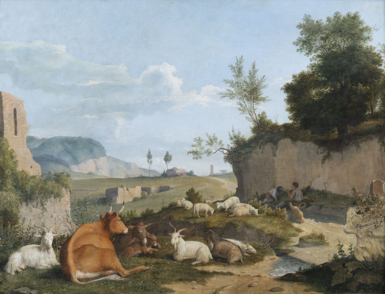 SÜDLICHE FELDLANDSCHAFT MIT HIRTEN UND VIEH BEI DER RAST