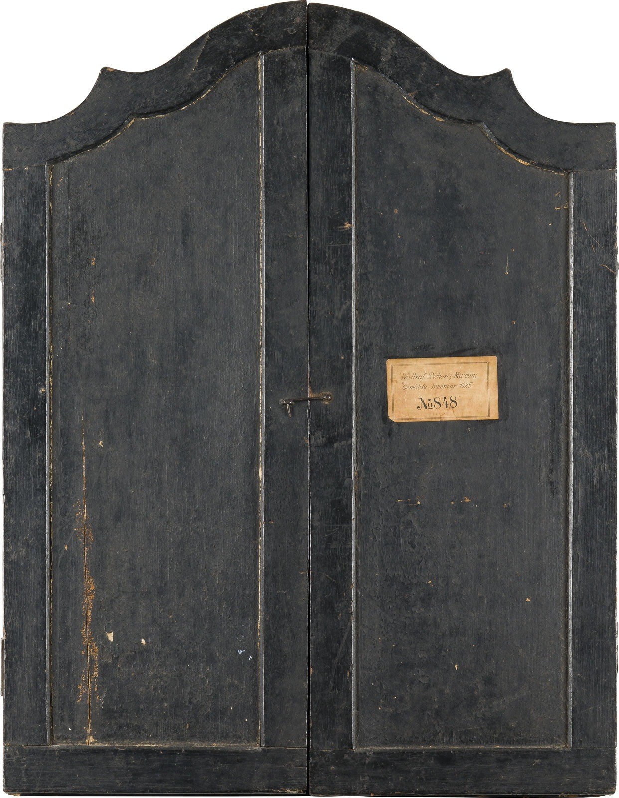 FLEMISH SCHOOL, AROUND 1520/1540 TRIPTYCH: THE CRUCIFIXION, THE CARRYING OF THE CROSS AND THE RESURRECTION OF CHRIST Oil on oak. Closed: 64.5 x 50 cm; open: 64.5 x 99.5 cm. Lower right wing with inventory number "M. 487". Verso: on the wing with old paper label "Wallraf-Richartz-Museum, Gemälde-Inventar 1925 No. 848". Part. min. old rest., part. min. old retouching, tension cracks. Frame. Provenance: Private collection, North Rhine-Westphalia; previously: Wallraf-Richartz Museum, Cologne.