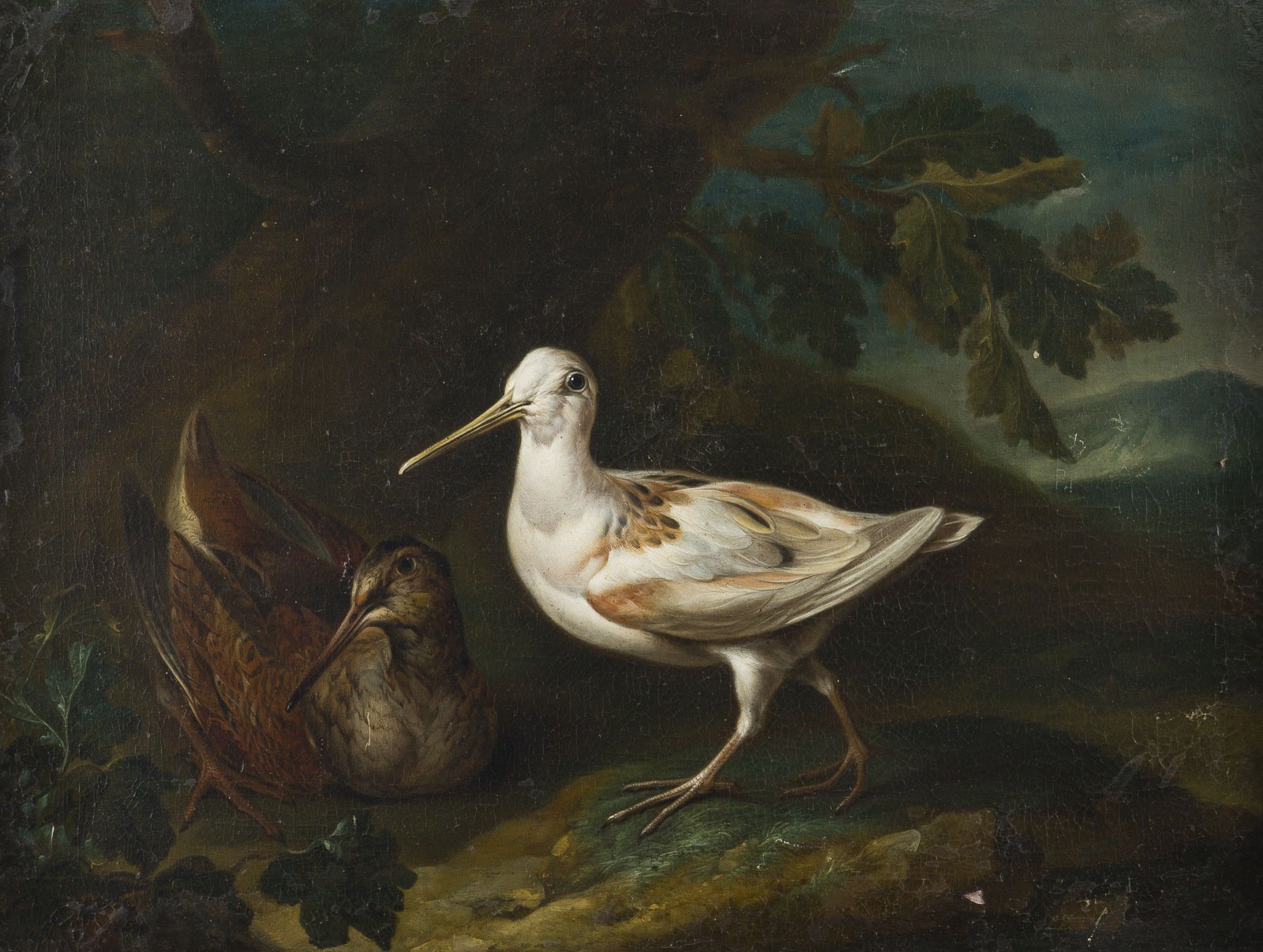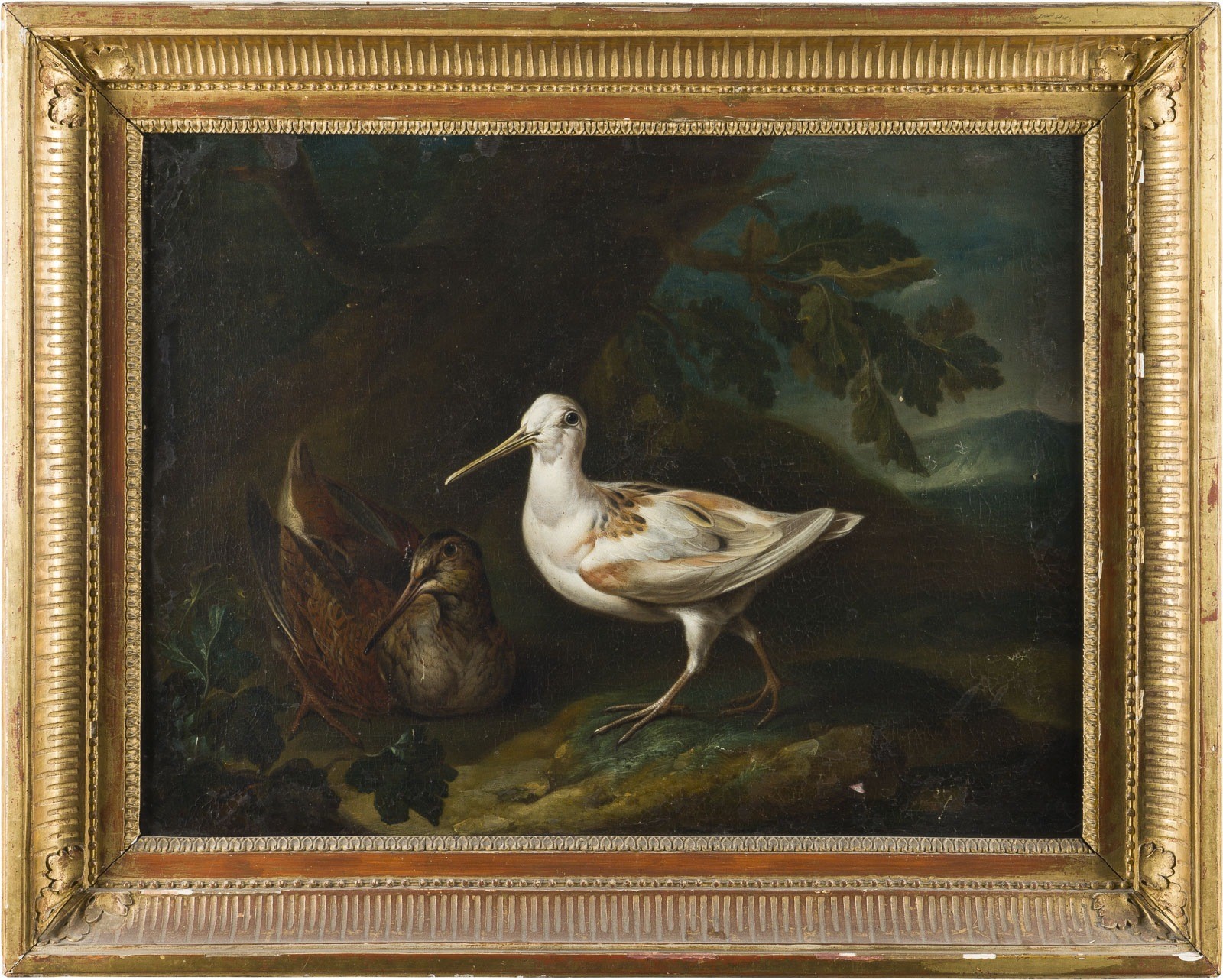 ATTRIBUTED TO PHILIPP FERDINAND DE HAMILTON Around 1664 Brussels - 1750 Vienna WHITE SNIPE Oil on canvas (relined). 46 x 61 cm (F. 61 x 76 cm). Part. min. old rest., part. old retouching, slight loss of colour. Frame. Provenance: Private collection, North Rhine-Westphalia.