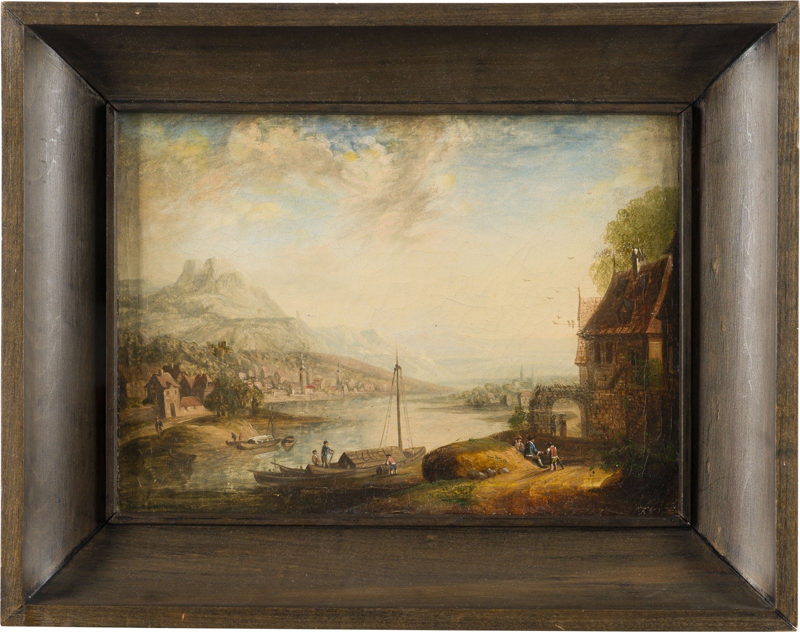 ATTRIBUTED TO HERMAN SAFTLEVEN 1609 Rotterdam - 1685 Utrecht WIDE RIVER LANDSCAPE NEAR A VILLAGE WITH FISHERMEN Oil on canvas (relined). 23 x 30 cm (F. 32 x 40 cm). Min. old rest., part. old retouching, craquelure. Frame. Provenance: Private collection, North Rhine-Westphalia.