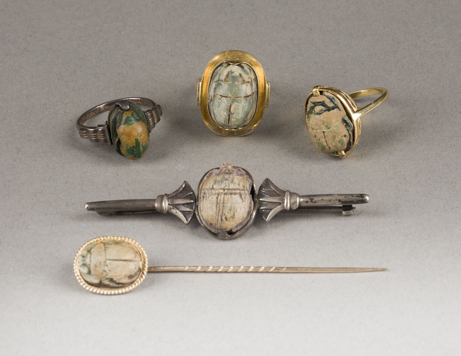 FÜNFTEILIGES SKARABÄUS-SCHMUCK-ENSEMBLE: DREI RINGE, BROSCHE UND NADEL
