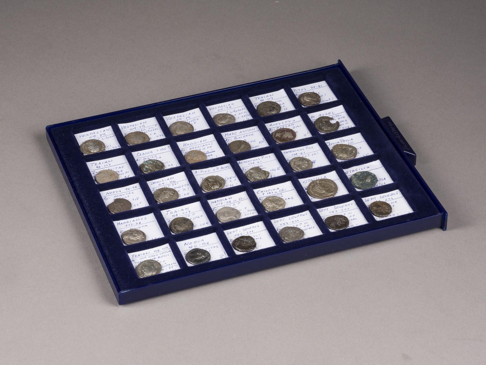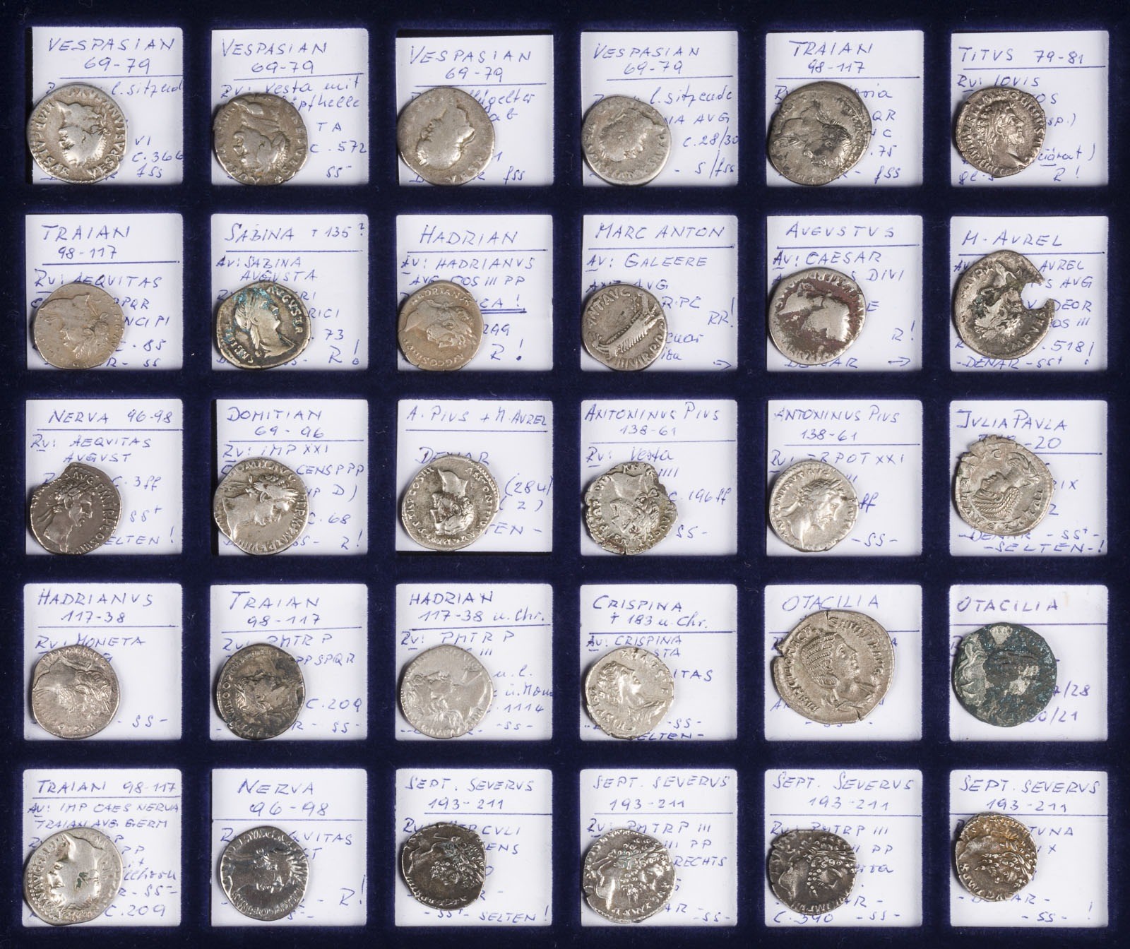 COLLECTION OF 30 ANCIENT COINS Roman Imperial Period, probably 27 BC to 235 AD Silver, bronze, cast in relief. Diameter approx. 1.5 to 2.5 cm. Includes coins with profile heads of emperors and members of the imperial family: Augustus, the first Roman emperor (27 BC - 14 AD), Vespasian, Titus, and Domitian - the Flavian dynasty (1st century AD), Nerva, Trajan, Hadrian, and Antoninus Pius - the adoptive emperors of the 2nd century, Marcus Aurelius, Commodus, Septimius Severus, Aurelian, as well as female portraits of Sabina, Julia Paula, Crispina, and Otacilia Severa. Partially damaged.