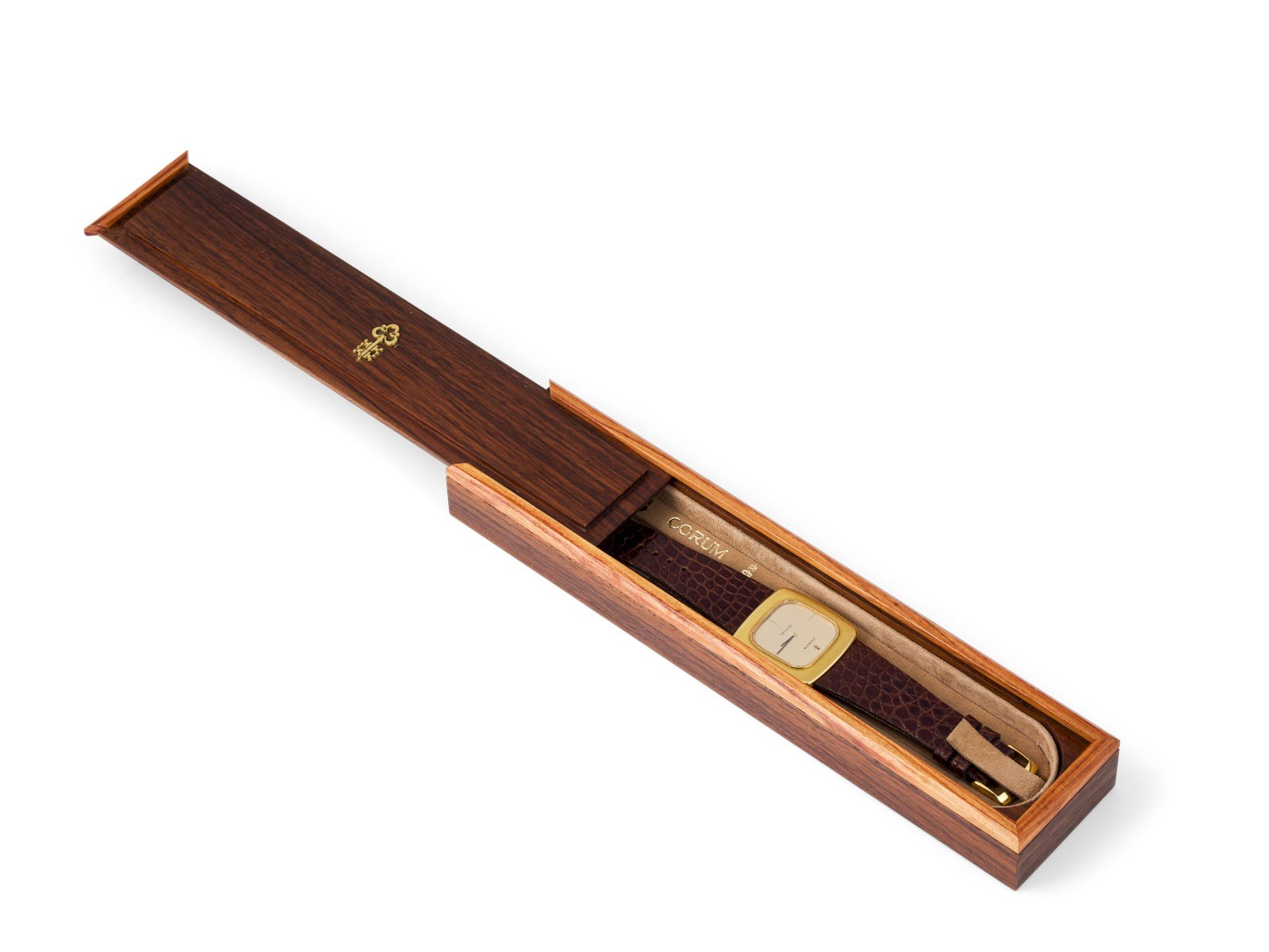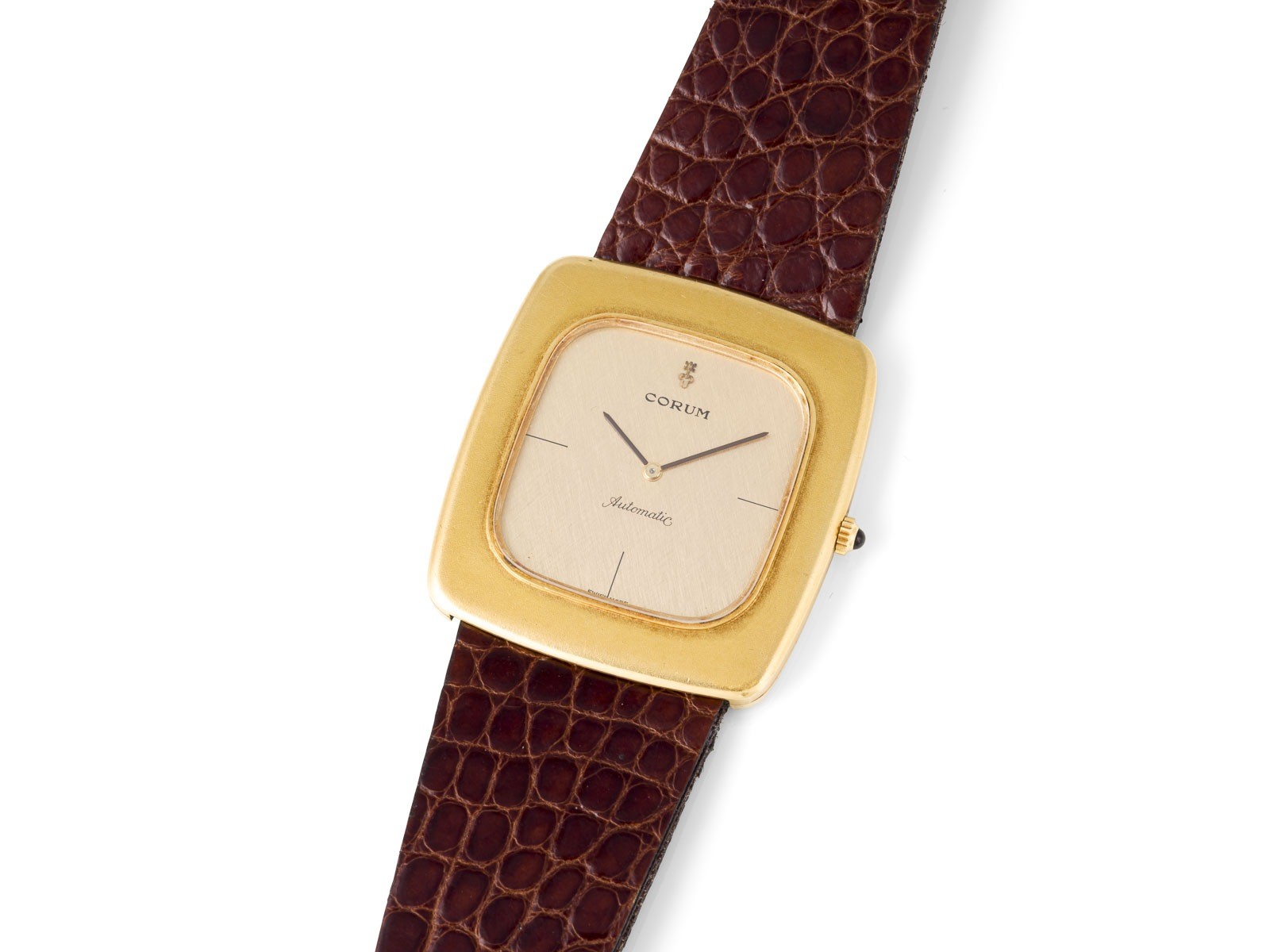 Referenznummer: 58301. Automatik. GG 750. Gehäuse ca. 35,0 x 37,0 mm, L. ca. 21,5 cm. Ges.-Gew.: ca. 48,4 g. Mit Original-Box. Edle Herrenuhr von Corum mit rechteckigem Gehäuse aus Gold. Das minimalistische