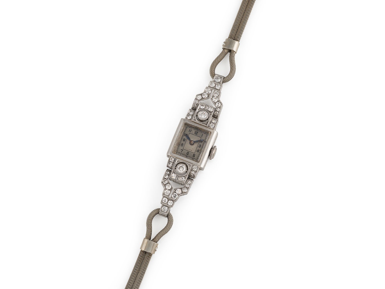 Handaufzug. Platin Pt, WG 585. L. ca. 15,5 cm., Gehäuse ca. 13,0 x 13,0 mm. Ges.-Gew.: ca. 15,5 g. Rechteckiges Gehäuse aus Platin, mit einem Brillanten, einem Diamanten im Altschliff und