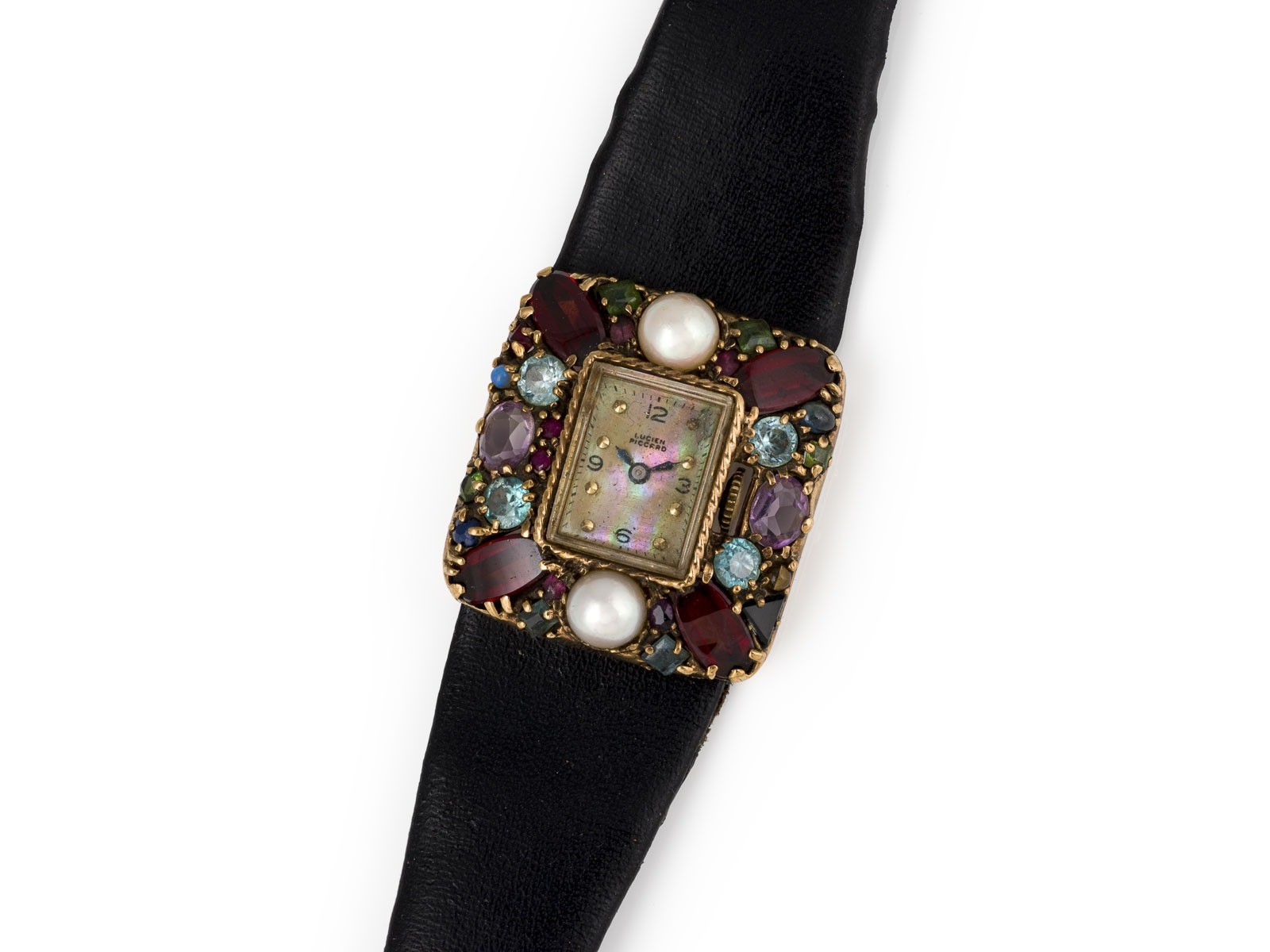 Handaufzug (Nicht auf Funktion geprüft). GG 585. Ges.-Gew.: ca. 29,3 g. Tutti Frutti Schmuck Uhr von Lucien Piccard, besetzt mit Edelsteinen. Dornschließe. Lederband stark gebraucht.