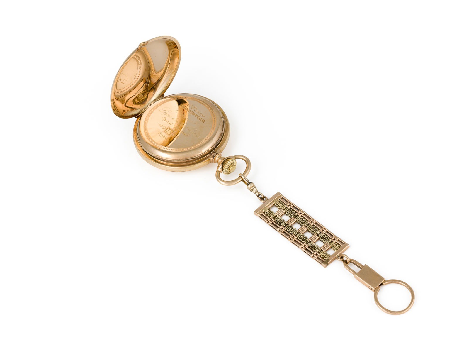 mm. Große 3-Deckel Taschenuhr aus Gold an einer Goldkette. Uhrwerkverglasung. 'No. 163539