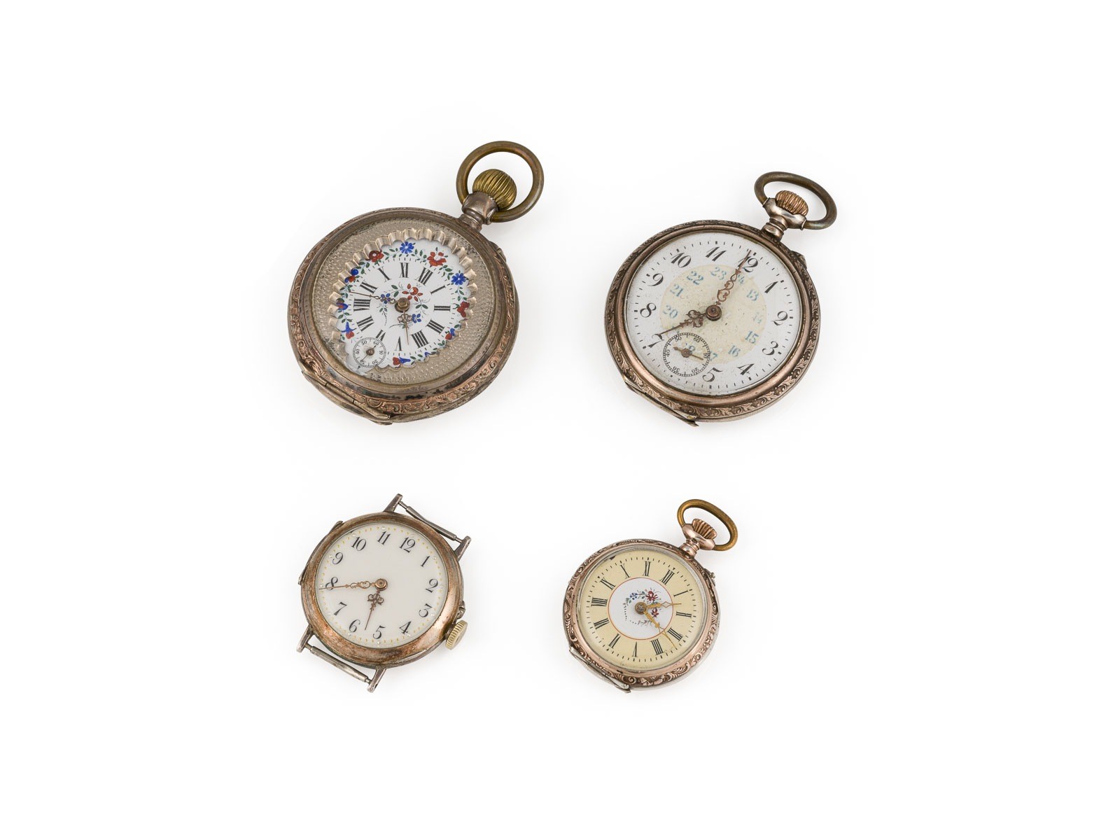 Handaufzug. AG 800, part. vergoldet. D.: ca. 3,0-4,5 cm. Ges.-Gew.: ca. 162 g. Drei Taschenuhren und eine Armbanduhr. part best. und ber.