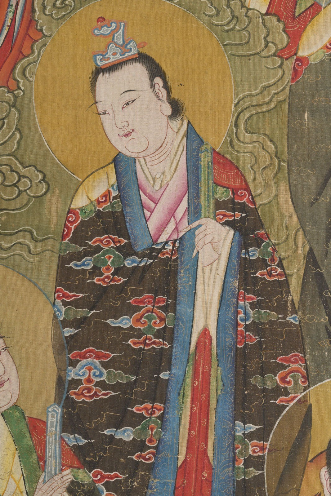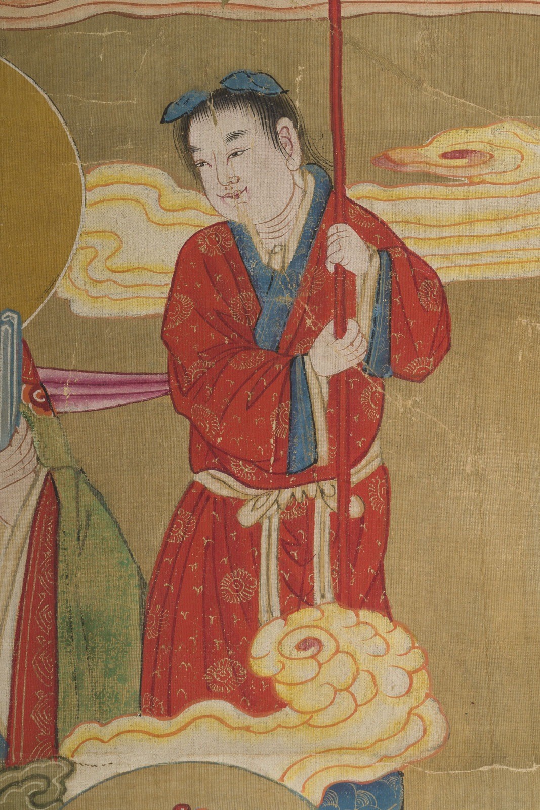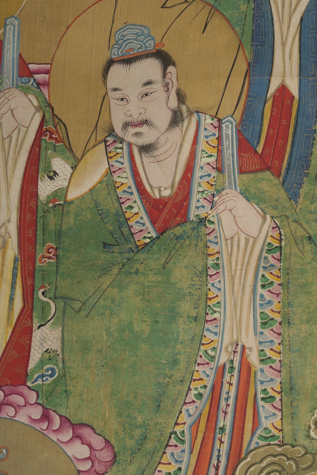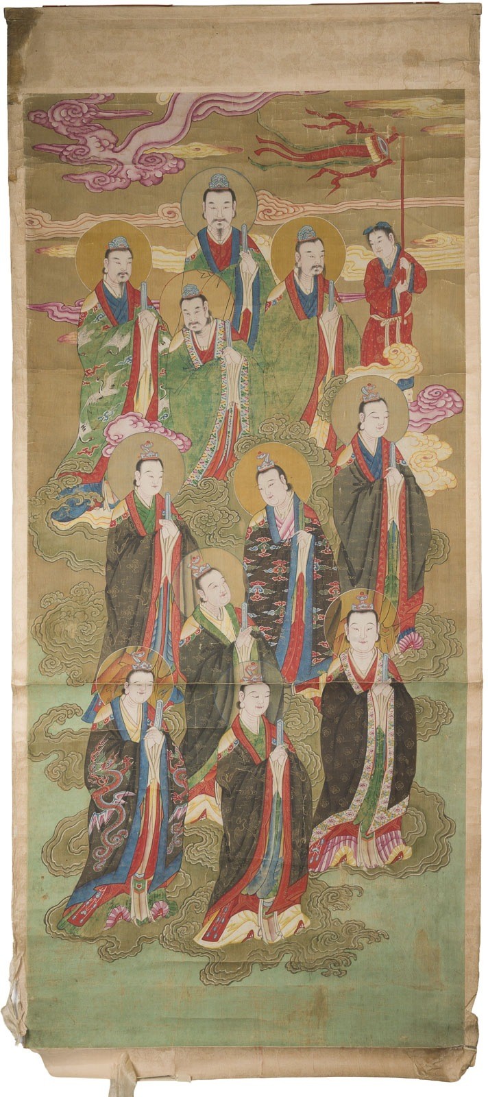 ANONYMOUS, A DAOIST PAINTING OF DEITIES China, 18th/19th century Ink and color on silk, mounted as hanging scroll. 194 x 89 cm. Depicting eleven deities dressed in robes and holding implements amidst swirling clouds, with an attendant holding a flag inscribed with characters. With traces of age, partially creased and slight loss of color, the mount damaged.