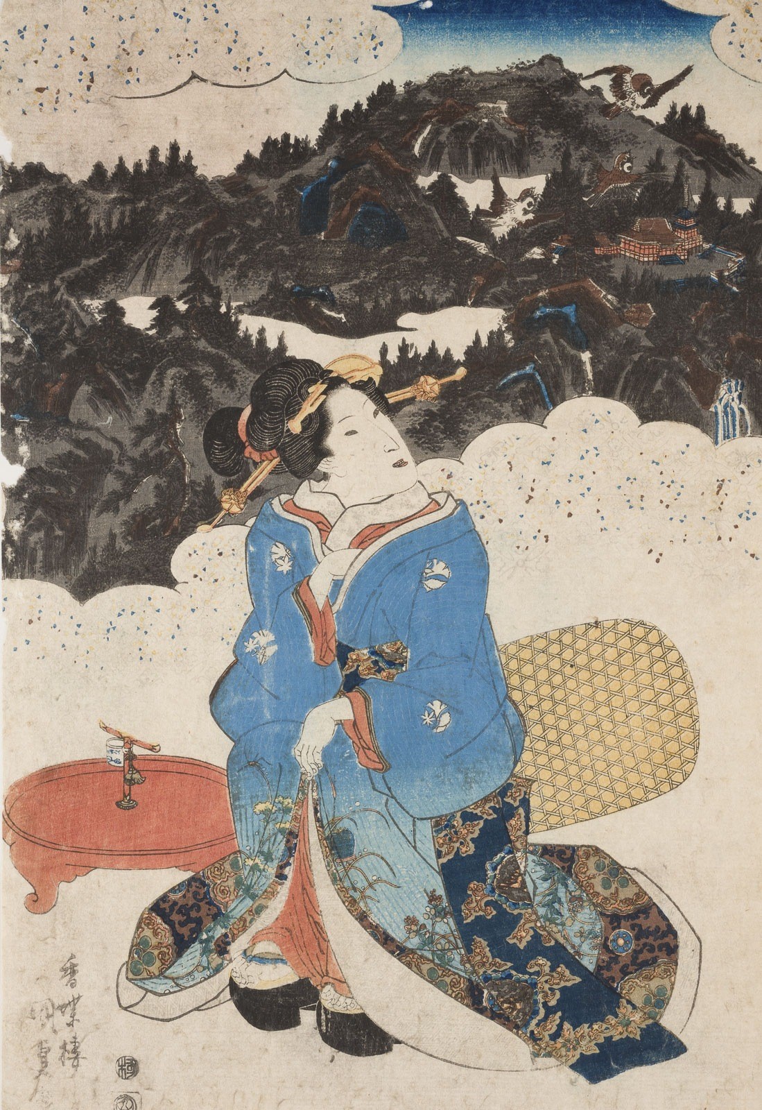 KUNISADA UTAGAWA 1786 - 1865 MOUNTAIN VIEW OF MOUNT KURAMA Japan, 1830 Woodblock print. 35.5x24.5 cm. Central panel of the triptych "Kochoro Kunisadaga", with censor's seal kiwame (approved), published by Tsuruya Kiemon (Senkakudo). With traces of age, partially damaged.