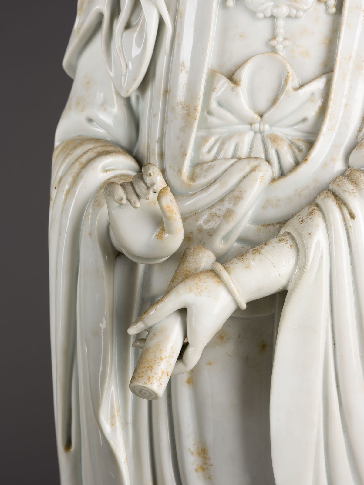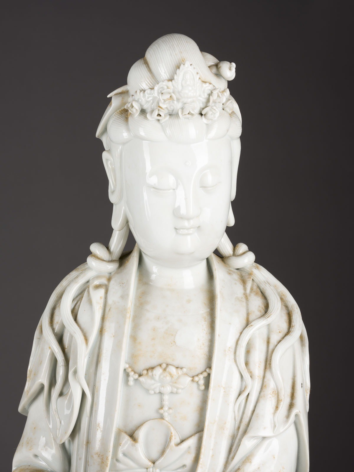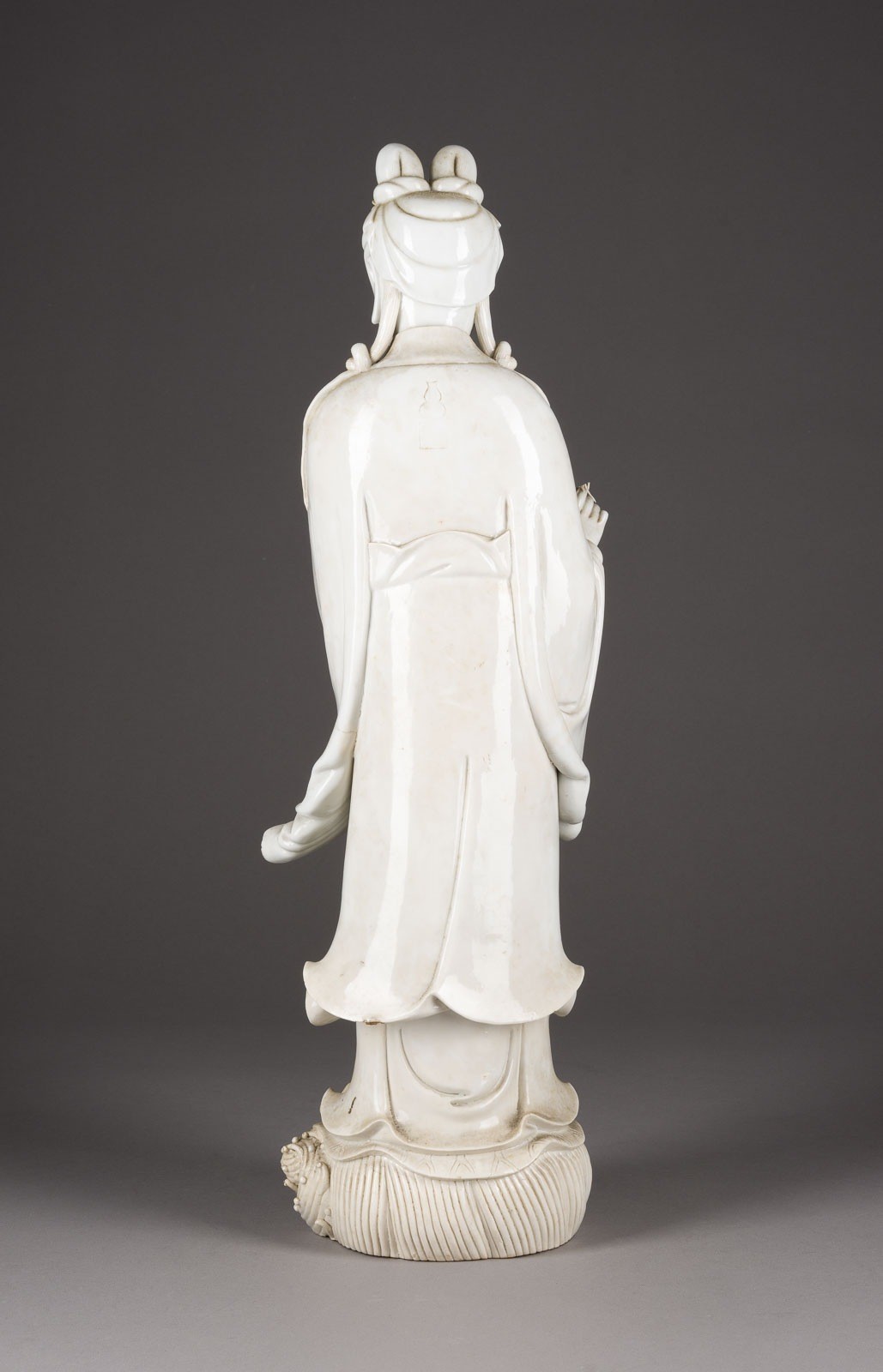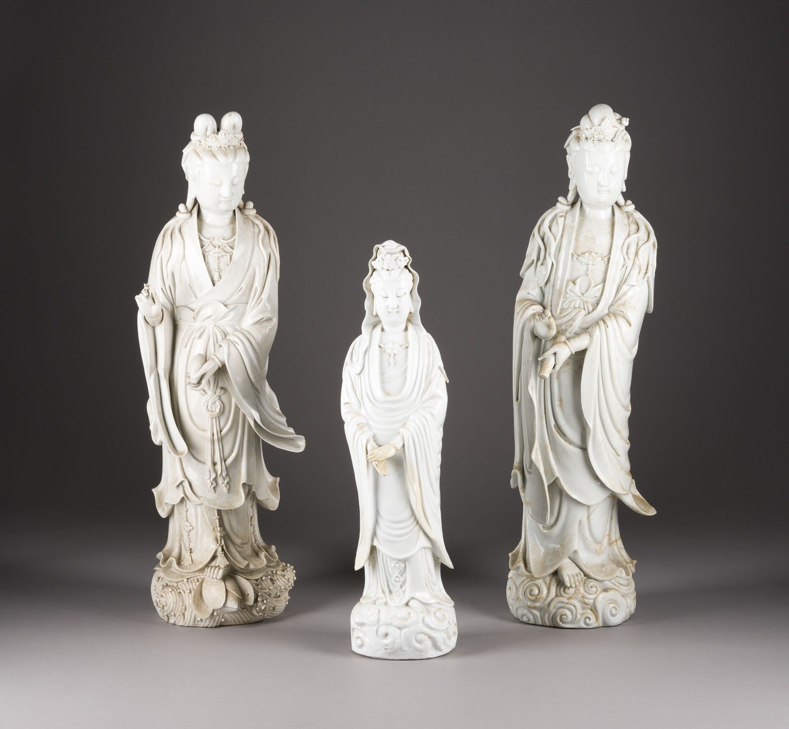 THREE BLANC DE CHINE FIGURES OF GUANYIN China Porcelain. H. 46-60 cm. Two of the Guanyin figures bear a double gourd mark and a six-character mark "daming wanli nianzhi". With traces of age, partially cracked, damaged and restored.