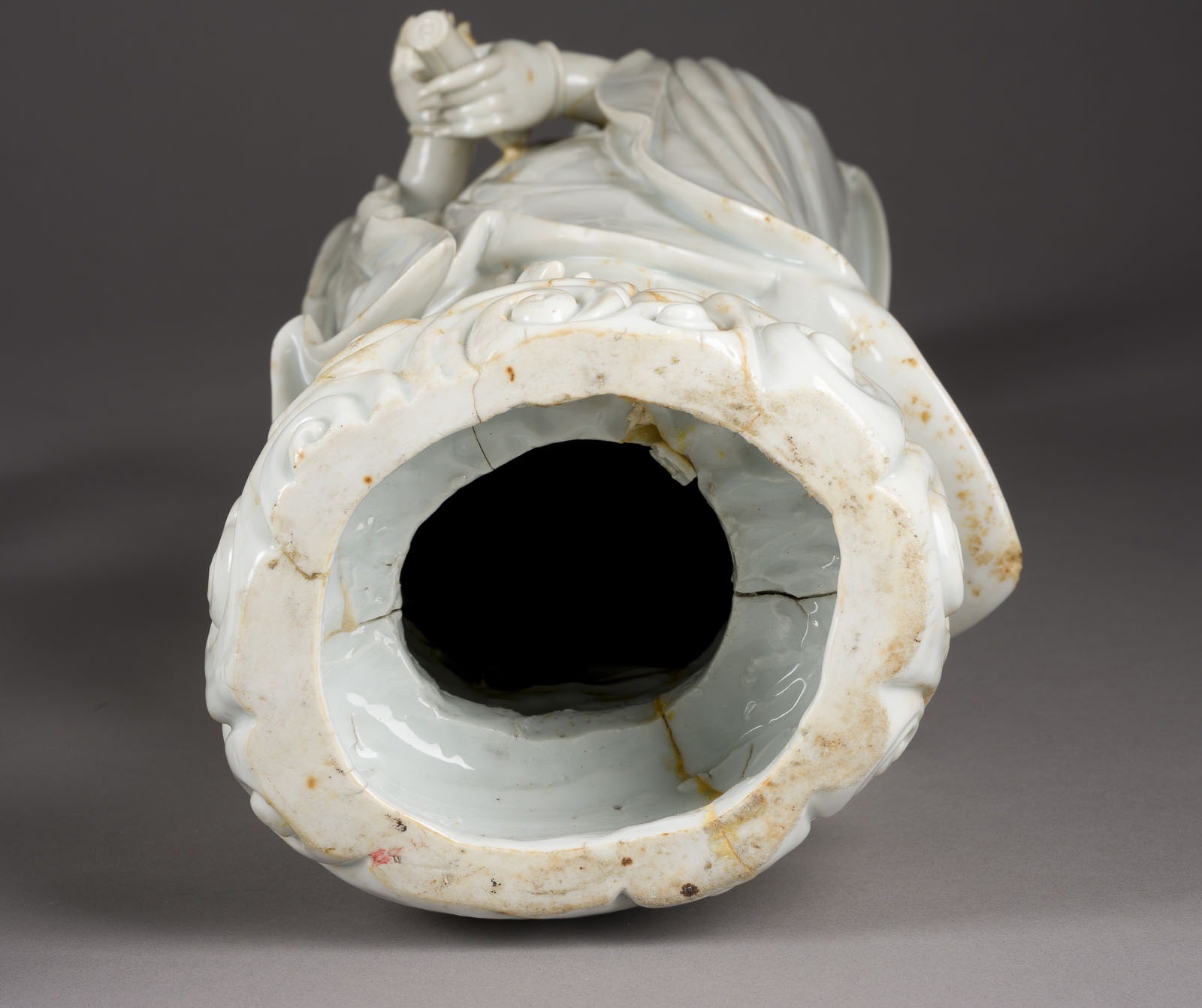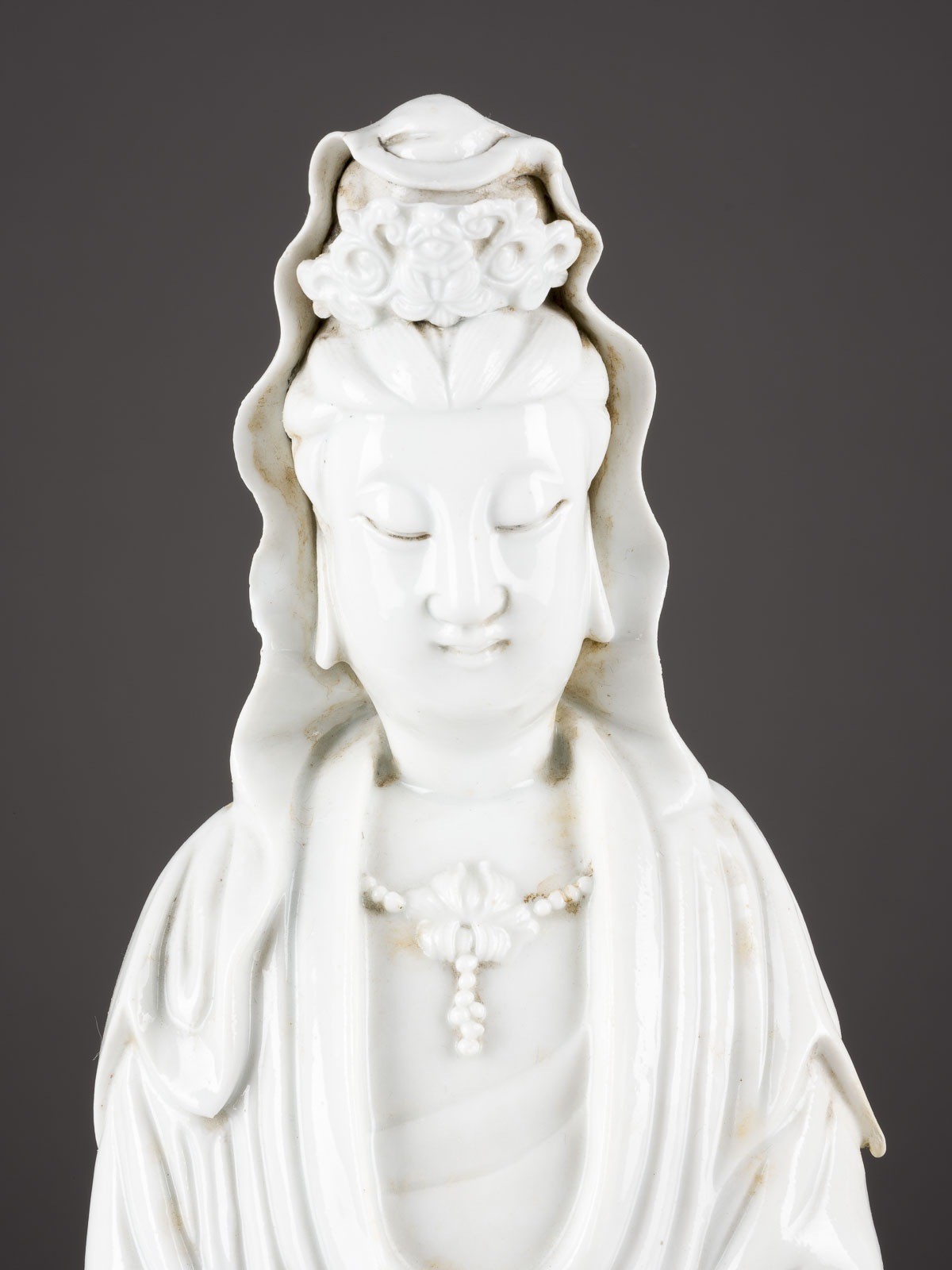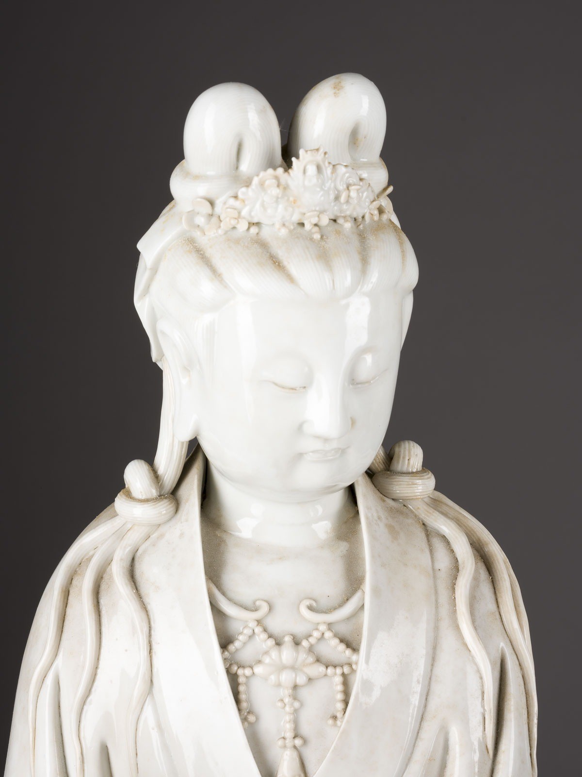 THREE BLANC DE CHINE FIGURES OF GUANYIN China Porcelain. H. 46-60 cm. Two of the Guanyin figures bear a double gourd mark and a six-character mark "daming wanli nianzhi". With traces of age, partially cracked, damaged and restored.