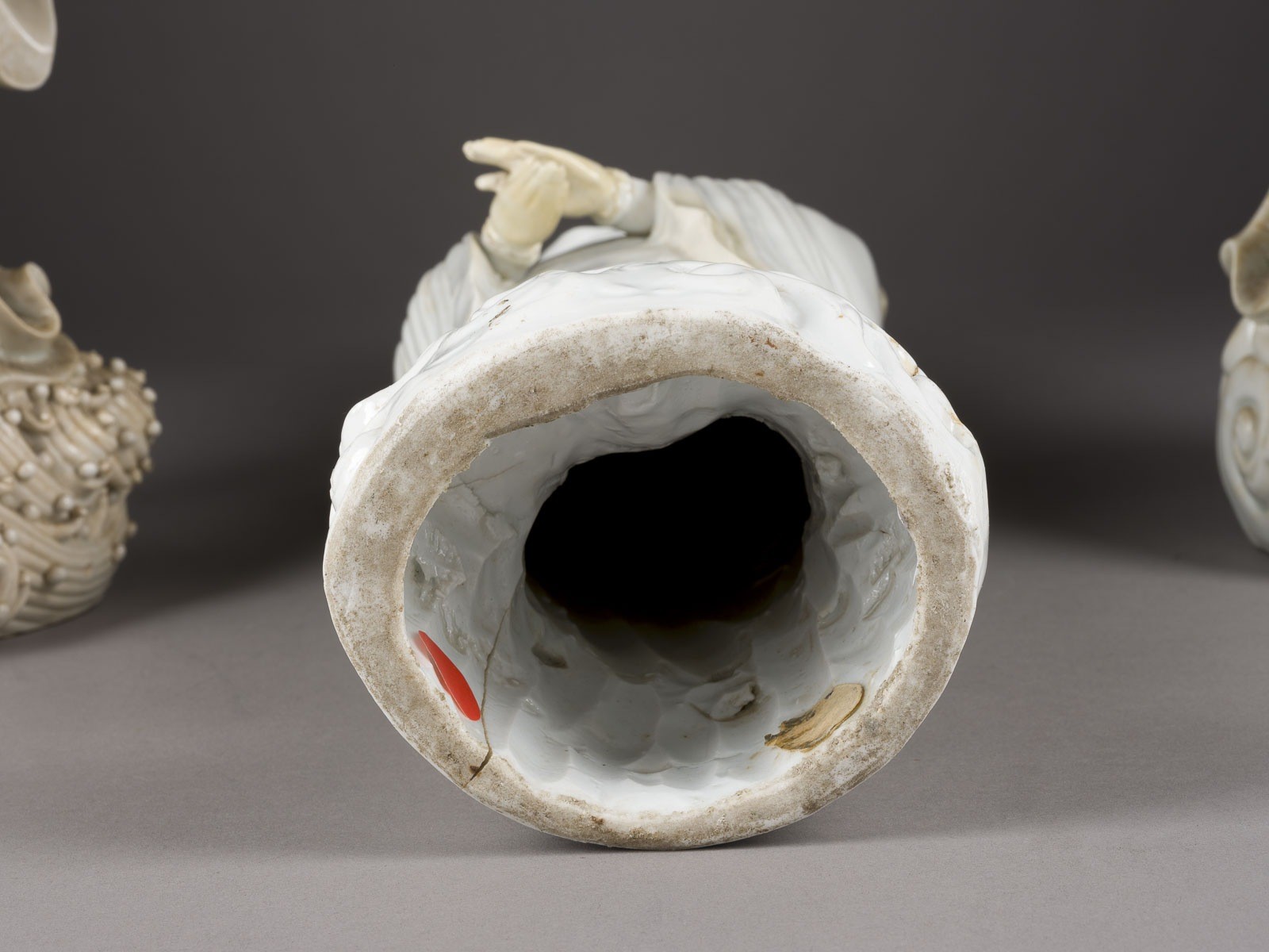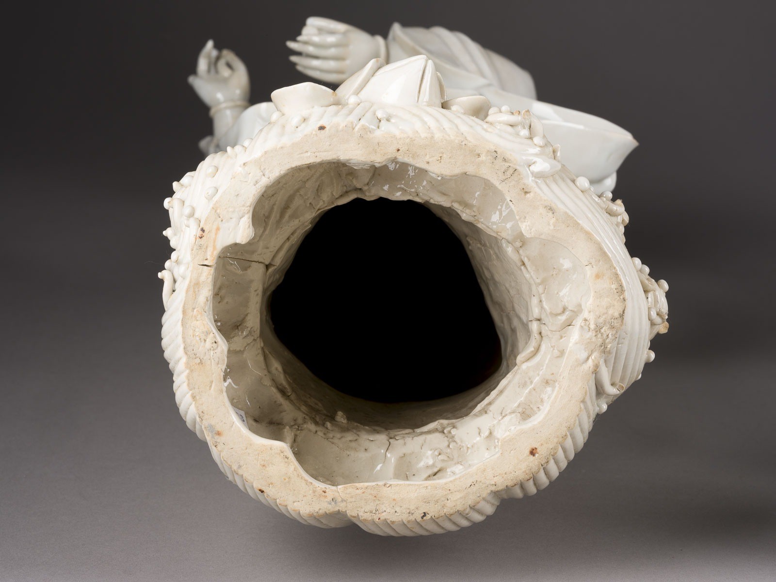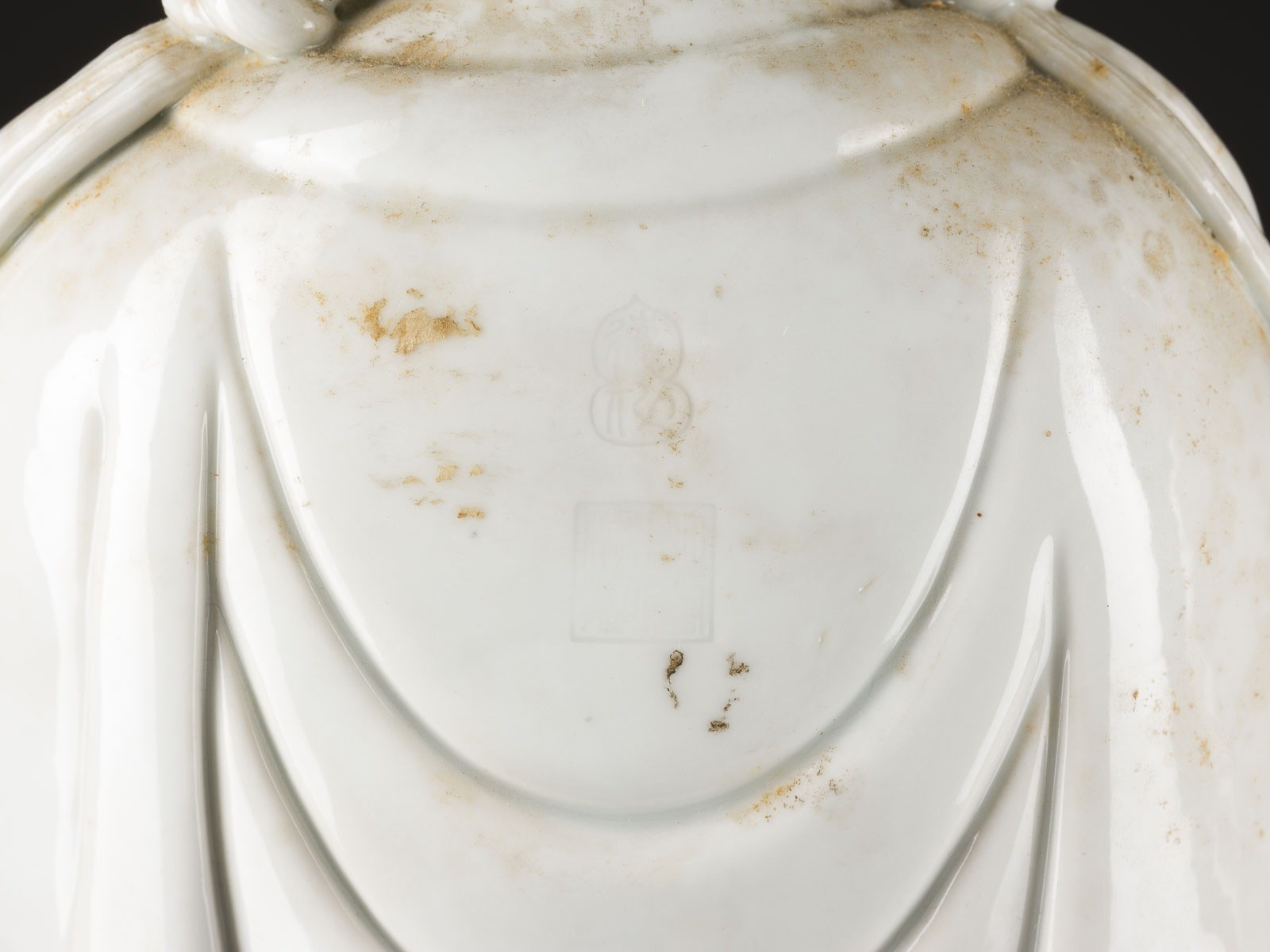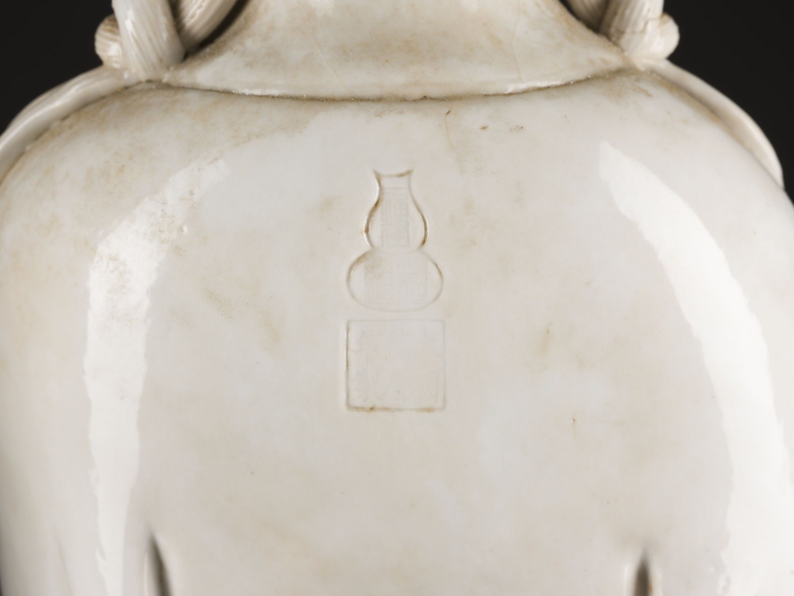 THREE BLANC DE CHINE FIGURES OF GUANYIN China Porcelain. H. 46-60 cm. Two of the Guanyin figures bear a double gourd mark and a six-character mark "daming wanli nianzhi". With traces of age, partially cracked, damaged and restored.