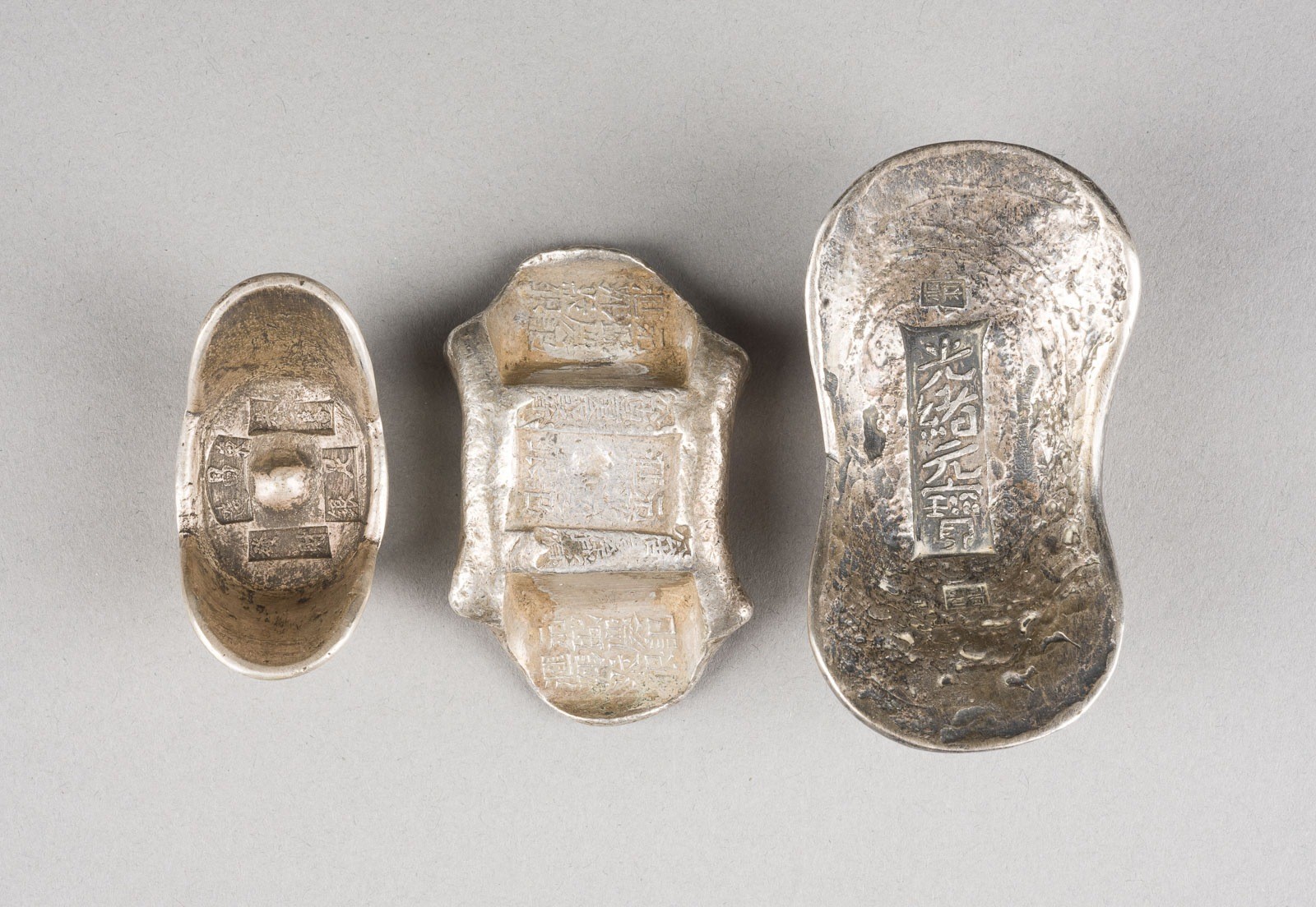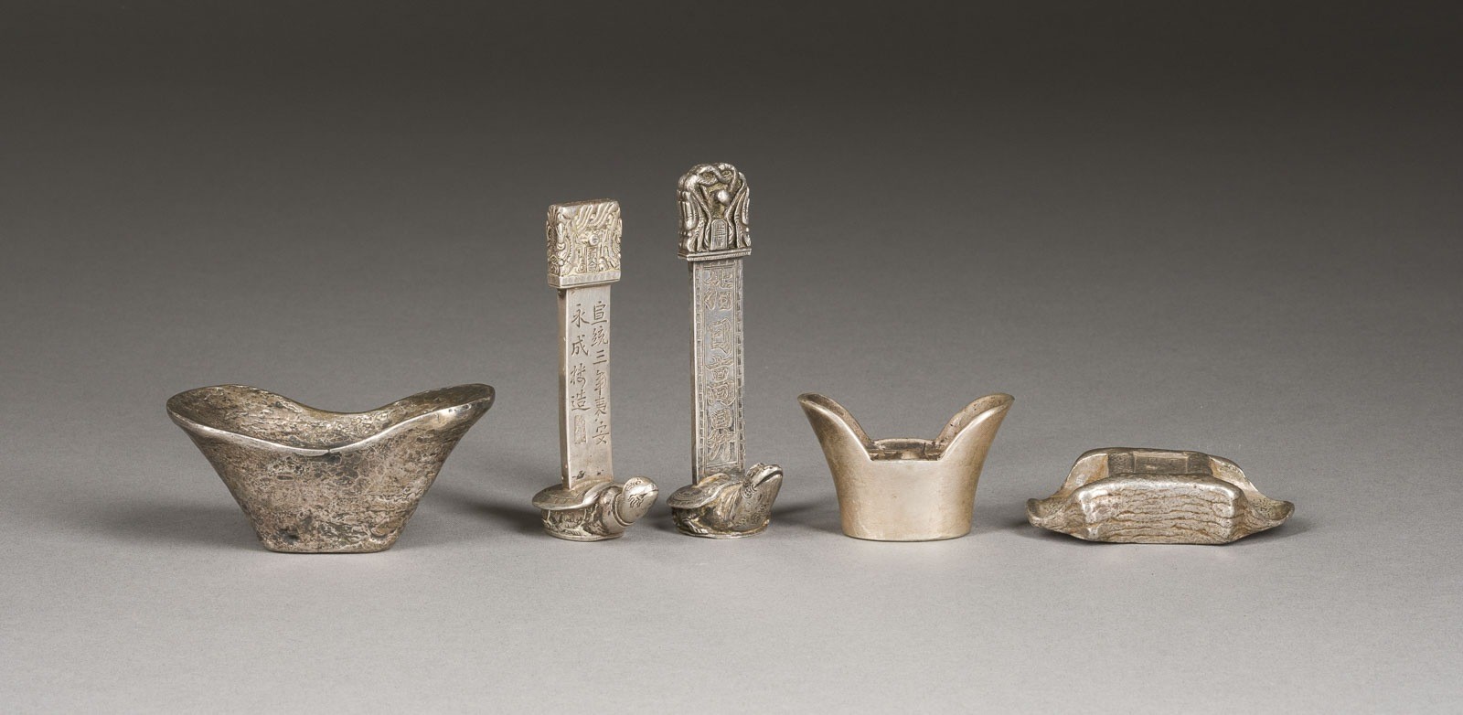 THREE CHINESE SILVER SYCEES AND TWO SILVER 'BIXI' SEALS China, late Qing Dynasty Silver. L. 5-7.5 cm (sycees), H. 7.8-8.5 cm (seals), total 742 g. Including a sycee with inscriptions carved into the silver reading "Guangxu Yuanbao" and two maker's marks; another with inscriptions "Yuan Sheng Qing Ji Hui Hao Wen Yin" and "Gong Gu Tong She Duan Kan"; a third marked "Dong Chang Zao Yu Yin" and "Er Liang"; as well as two seals, one carved with "Xuantong San Nian Yi An Yong Cheng Lou Zao". With traces of use and age.