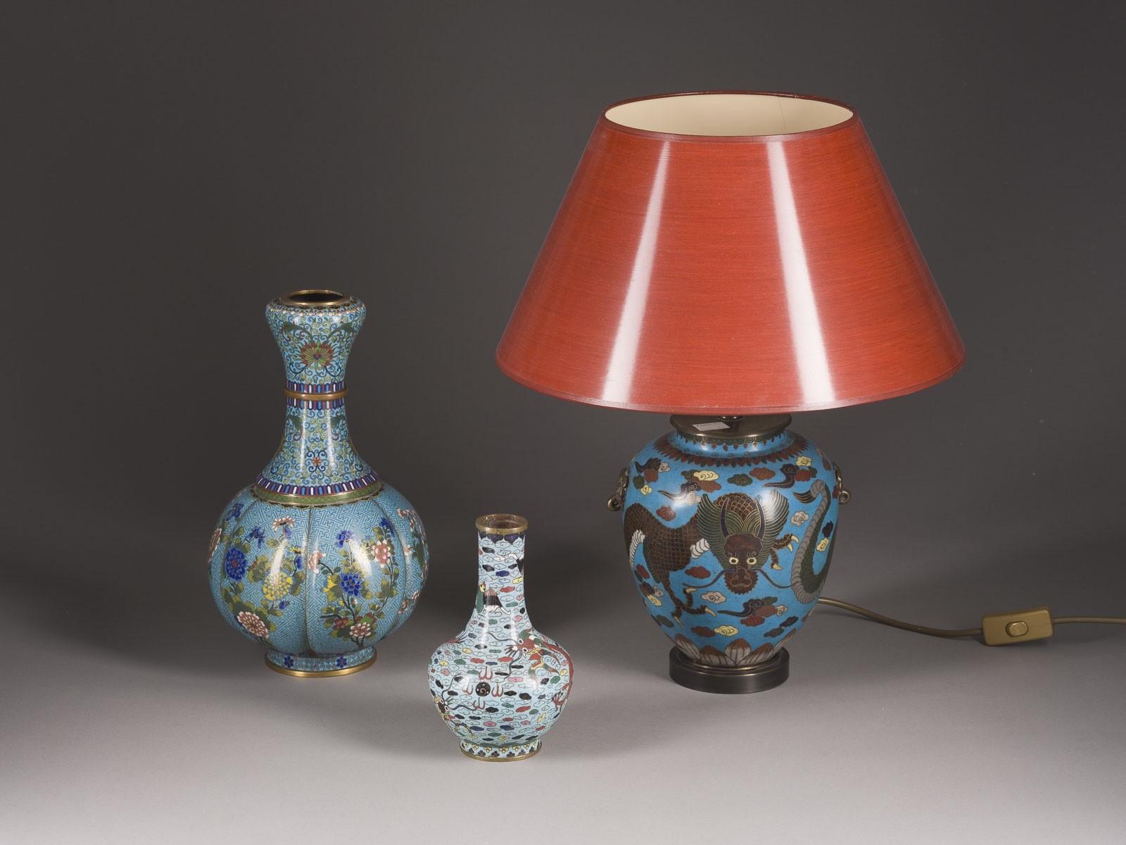 THREE CLOISONNÉ VASES China, 19th/20th century Cloisonné. H. 19-48 cm. Including a vase decorated with a dragon, a vase decorated with flowers, and a vase mounted as a lamp decorated with a dragon. With traces of use and age, partially abraded.