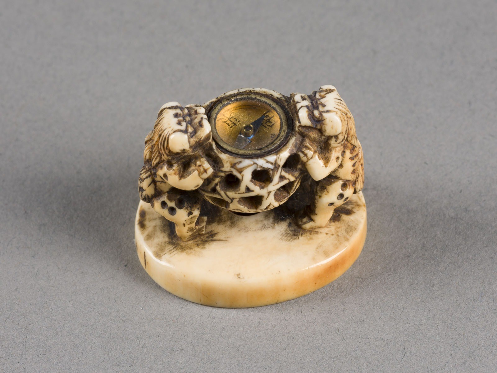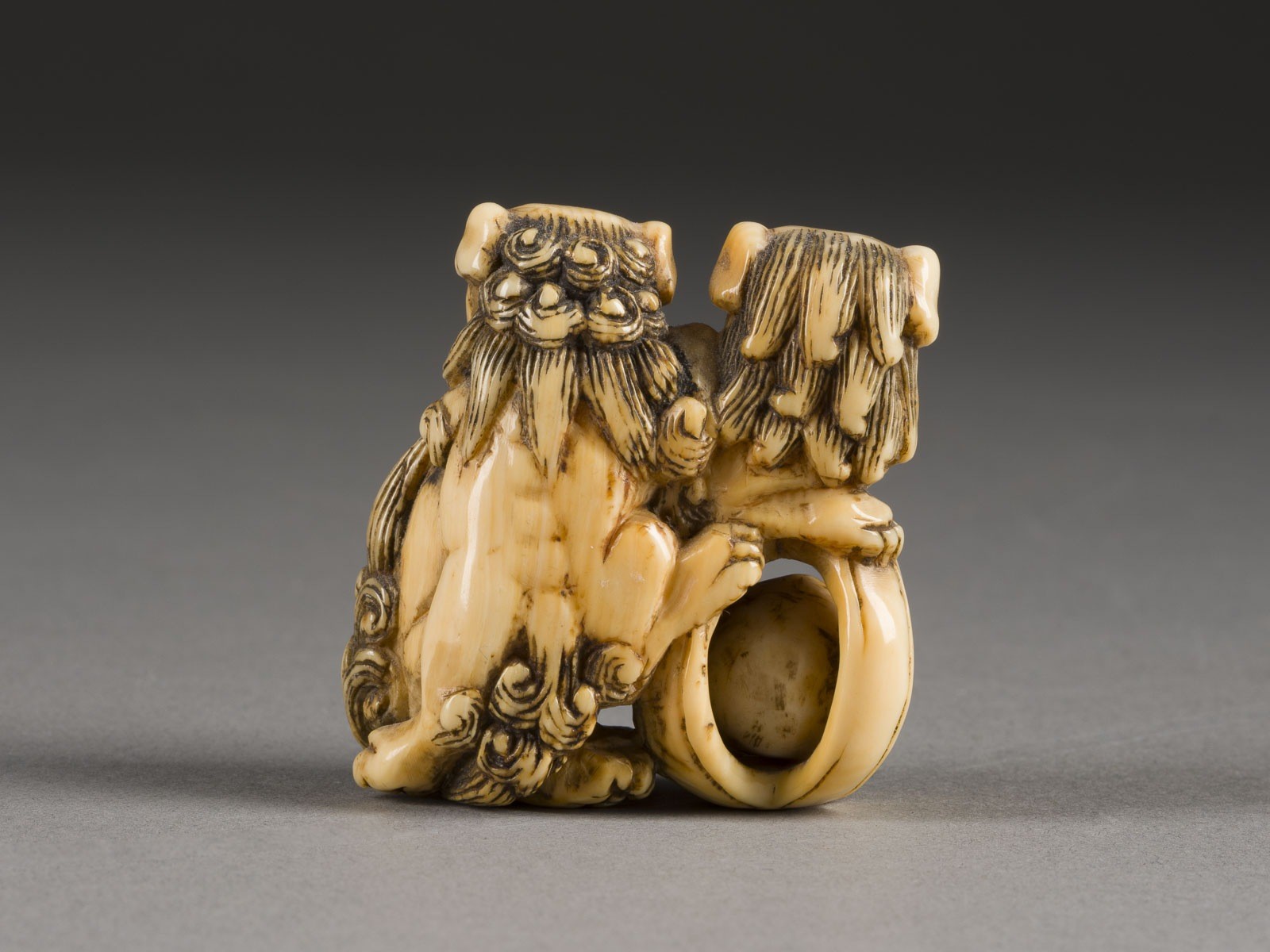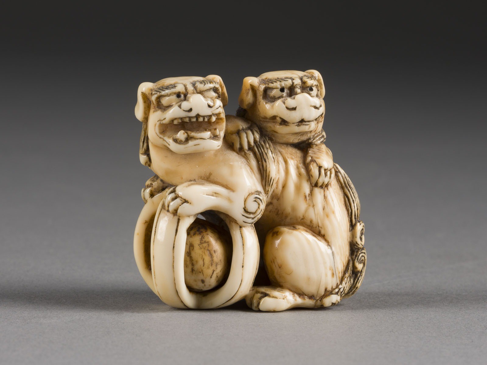 THREE IVORY NETSUKE OF SHISHI Japan, 19th century or later Ivory. H. 1.8-4.4 cm. With traces of use, partially cracked and abraded. Provenance: From an old private collection in North Rhine-Westphalia. CITES marketing certificate is available. Please note that due to the current CITES regulations for ivory and tortoiseshell objects, unrestricted trade is only permitted within the European Community. An export license is required for shipment to third countries. Please inform yourself about the current import regulations for ivory and tortoiseshell in your country. It is currently not possible to export ivory to the USA, Canada or England. This item is not legal to sell in the UK.