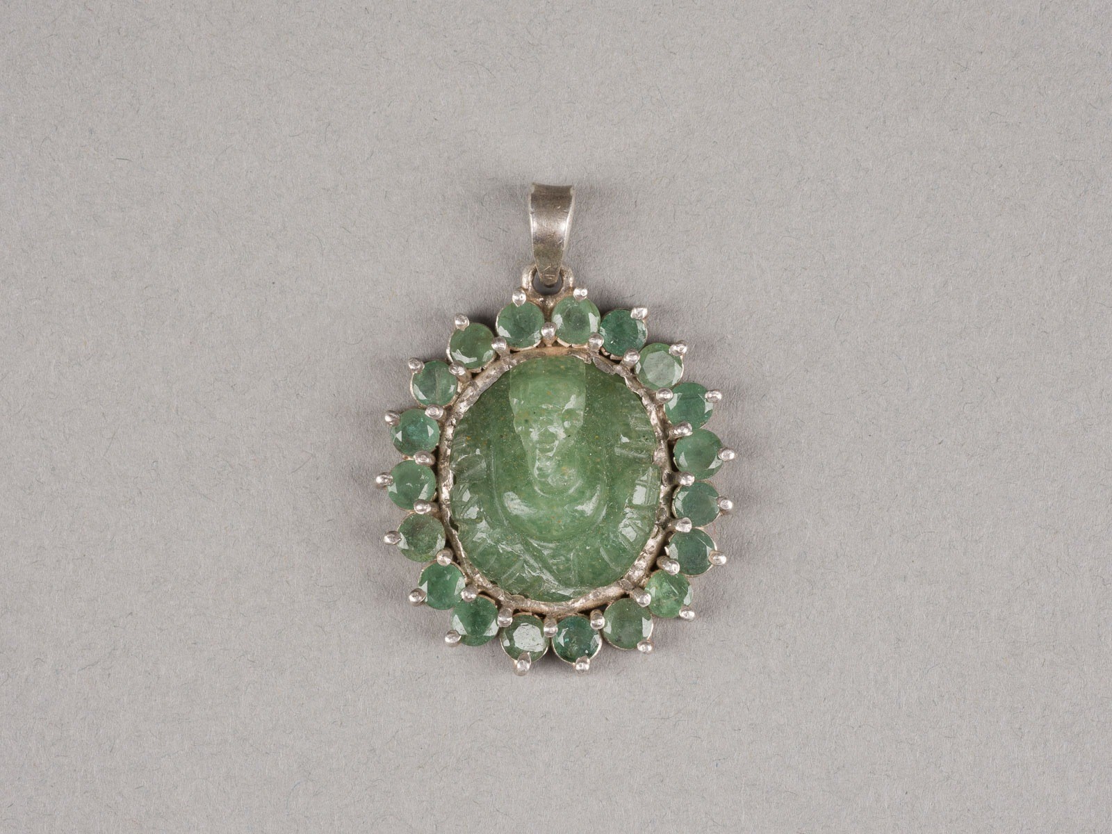 A PENDANT DEPICTING GANESHA India Probably emerald/jadeite/silver. L. ca. 3.5 cm. The pendant is centred with a jadeite carving of Ganesha, within a silver mount set with nineteen stones, probably emeralds. With traces of use and age. Provenance: From an old private collection in North Rhine-Westphalia.