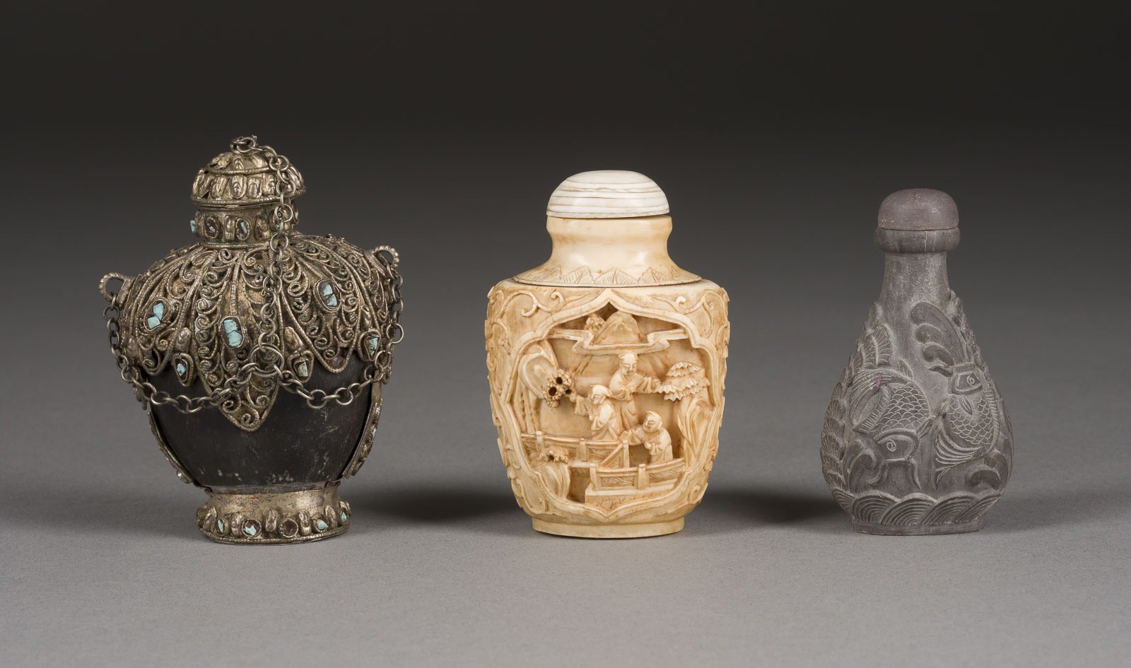 A GROUP OF THREE SNUFF BOTTLES China Bone/stone/metall etc.. H. 6.7-7.7 cm. With traces of use, partially abraded, and one snuff bottle with some loss of stone.