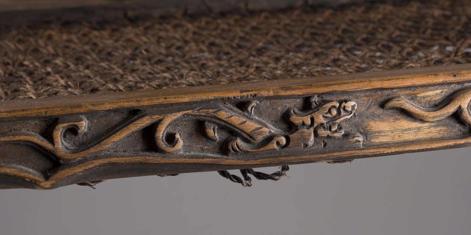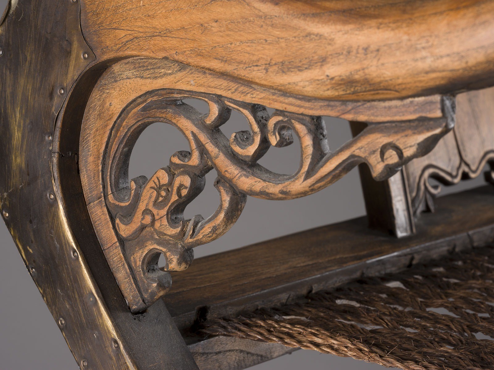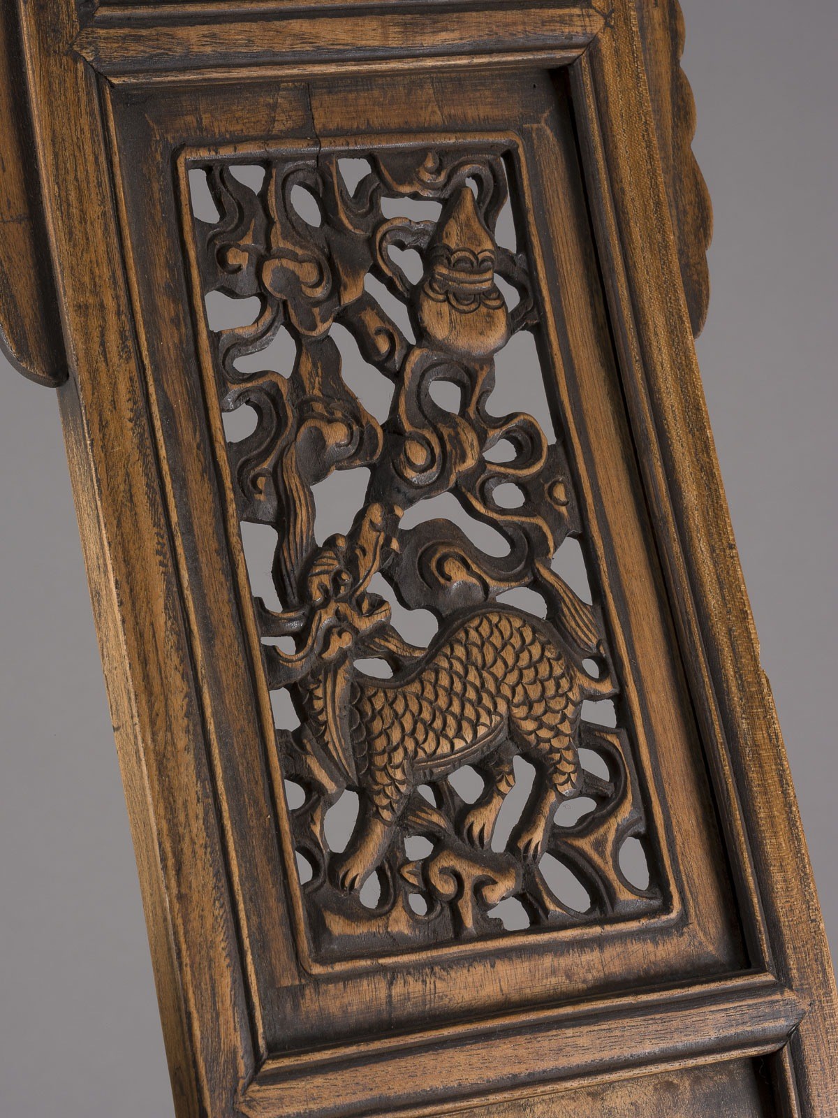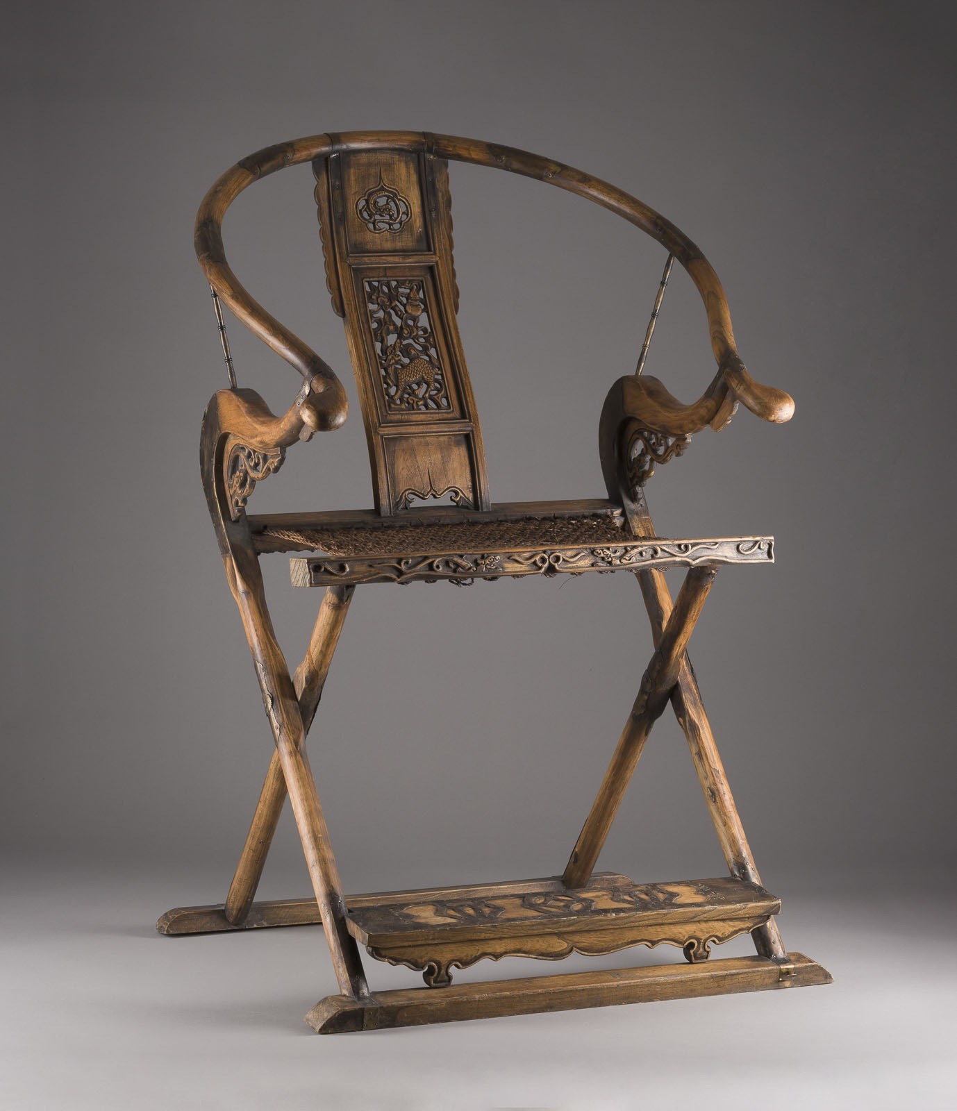A WOODEN FOLDING CHAIR China Wood. H. 107.5 cm. The backrest of the folding chair is finely pierced and carved with openwork designs of qilin and chilong. With traces of use, partially cracked and damaged.