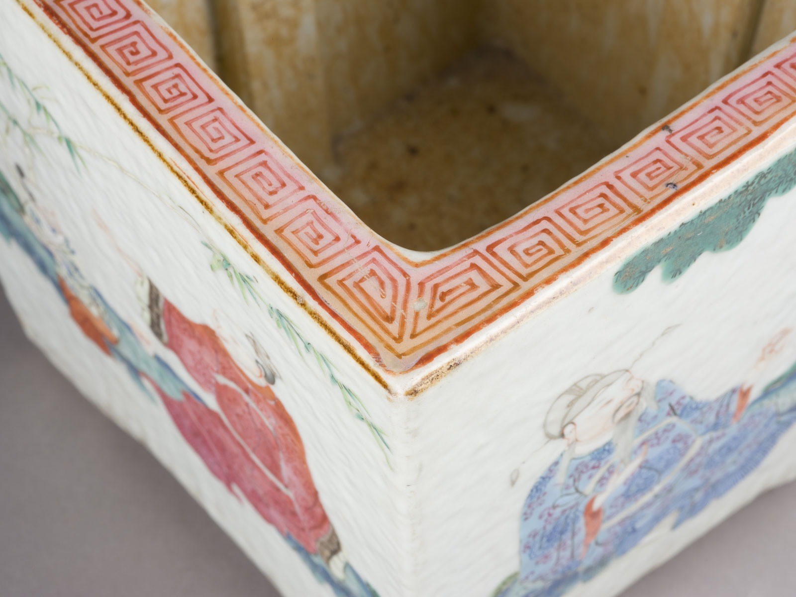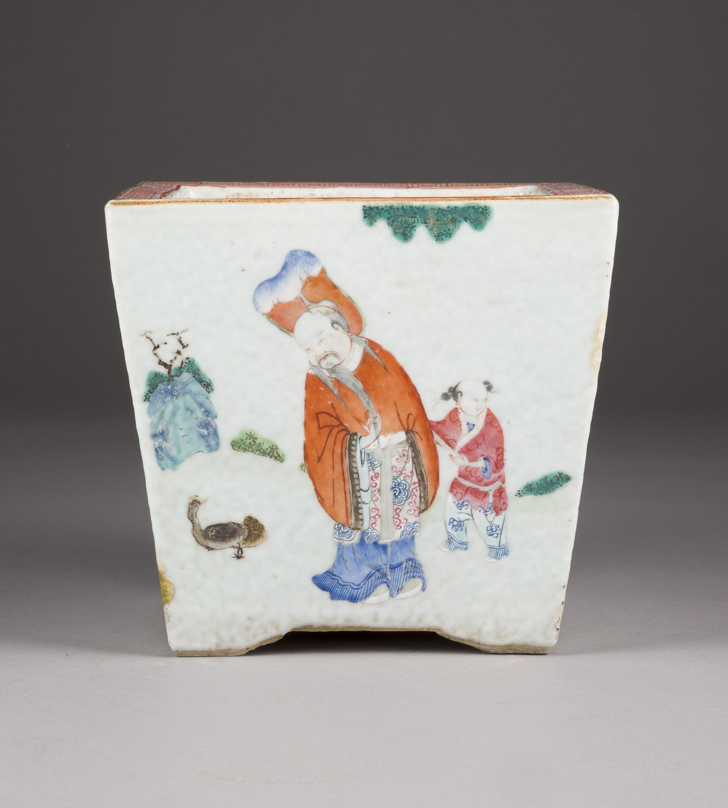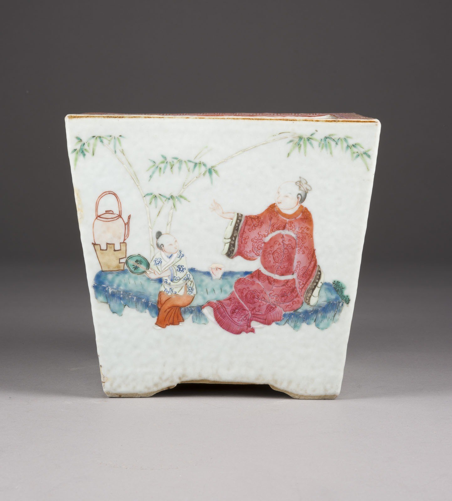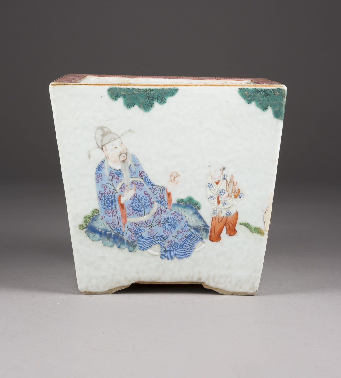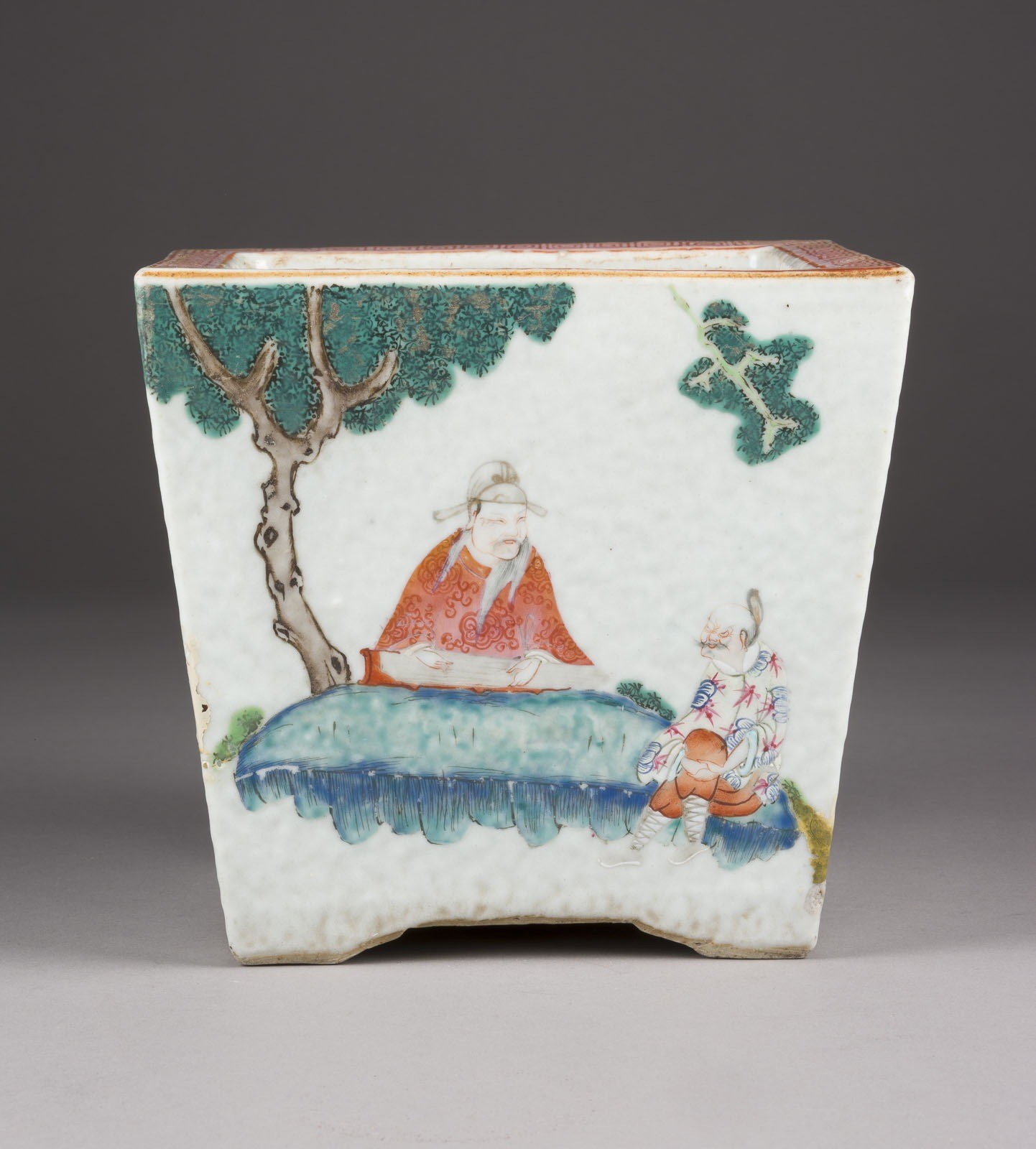 A FAMILLE ROSE 'FIGURAL' PLANTER China, late Qing Dynasty Porcelain. H. 18 cm. Rectangular-shaped planter decorated with daily life scenes of scholars and attendant boys. With traces of age and use, partially abraded; one minor edge damage, restored. Provenance: From a private collection in North Rhine-Westphalia.