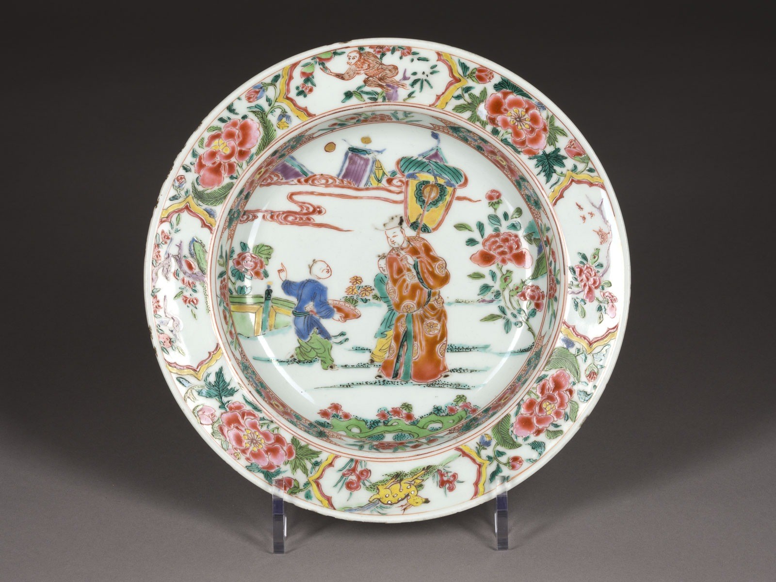A FAMILLE-ROSE 'FIGURAL' PLATE China, Mid-Qing Dynasty Porcelain. D. 22.7 cm. With traces of age and use, partially abraded and chipped along the rim.